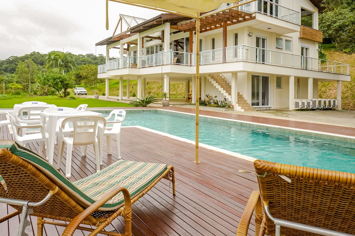 Experience unforgettable moments in this unique place, ideal for families. House on the banks of the river with a beautiful view of the Marumbi peak and swimming pool (not heated). A place to rest, bathe in the river or pool, ride a bicycle, hike to visit the nearby waterfalls, and enjoy Morretes with all the comforts. The house has a kitchen with a stove, living and dining room, 3 suites, indoor fireplace, swimming pool, playground and beach tennis court. WE CHARGE PETec FEE