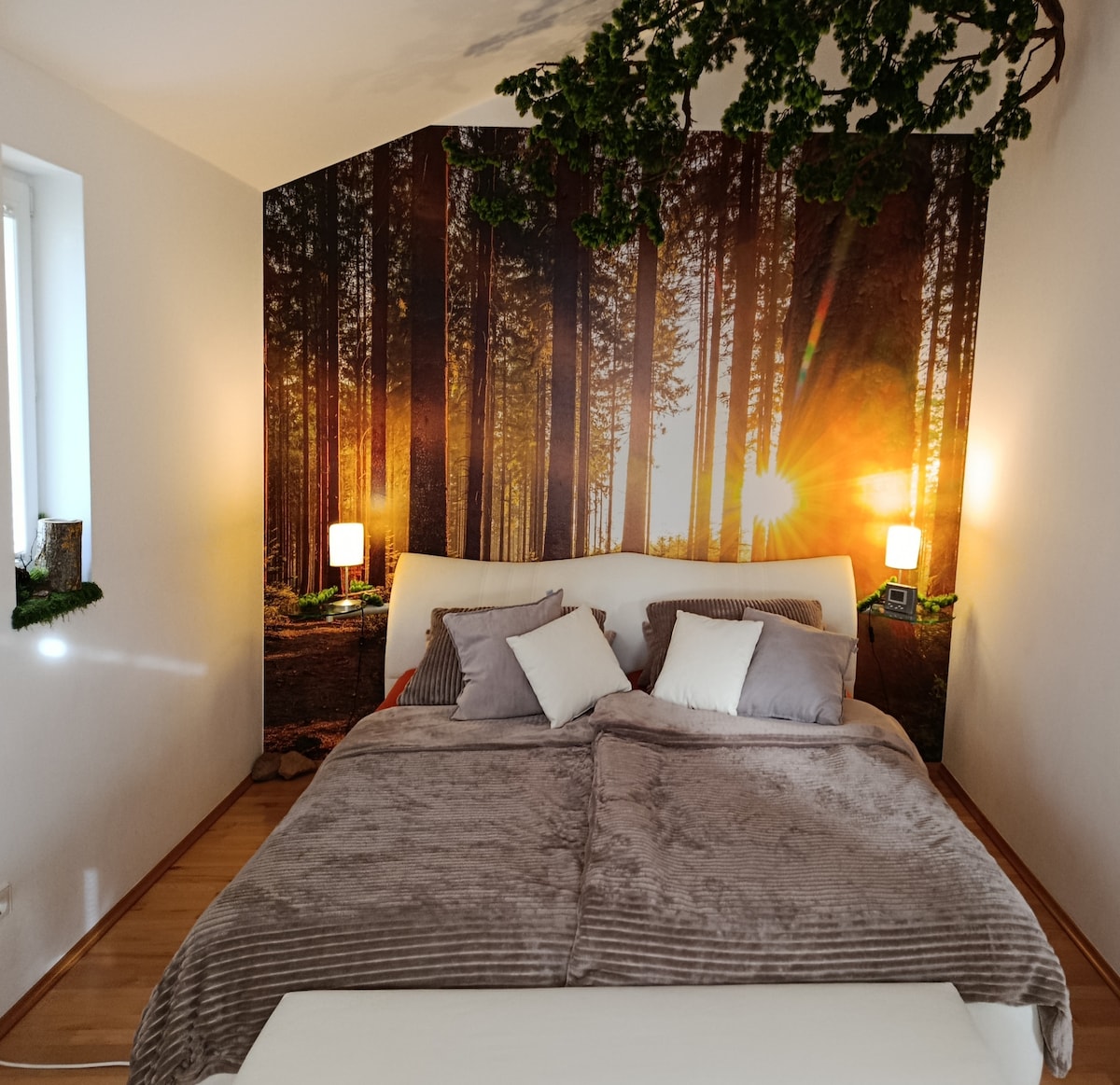 Our newly renovated, large apartment is part of a historic square courtyard. On the upper floor there is a large, cozy kitchen-living room with great views and a fireplace, merging into an open living room, as well as two spacious bedrooms, each with a double bed (1.80 x 2.00 m) and a wardrobe. On the first floor there is a small bedroom with a double bed and a large bathroom with a bathtub and shower. It includes a parking space and a private, fenced garden.
