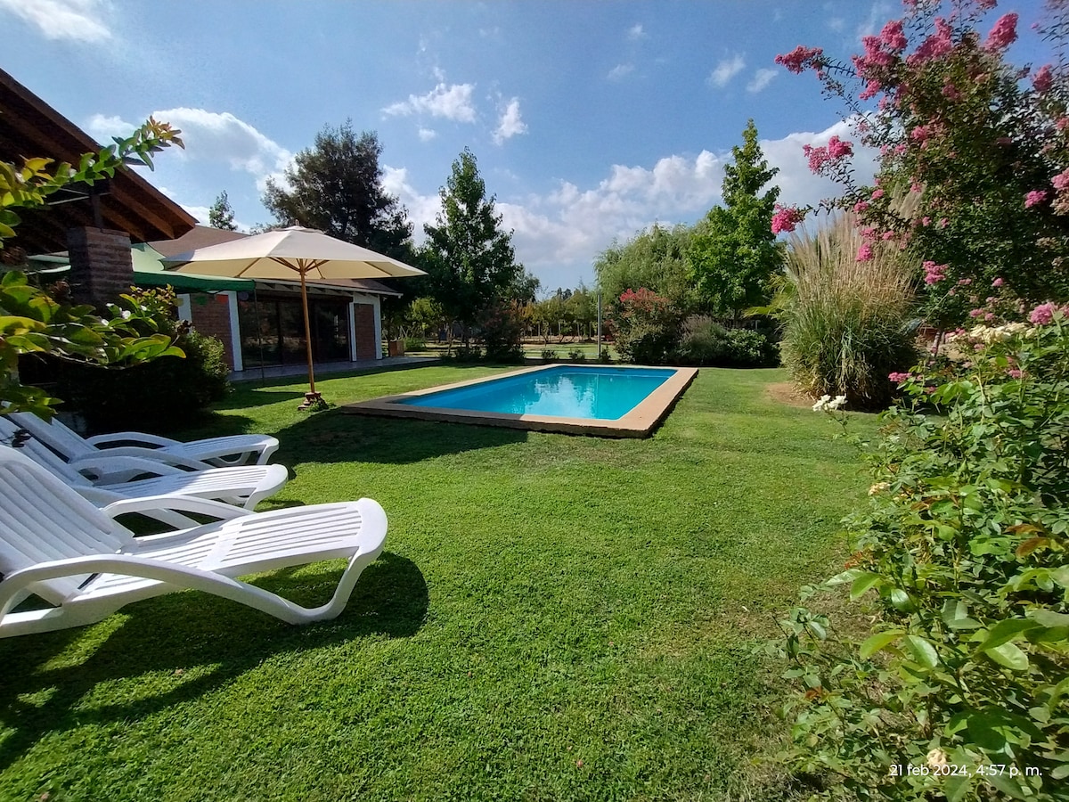 Charming plot with exclusive pool, trees and gardens. It is a complete house in a private space ideal for relaxing, enjoying with family, working remotely in the middle of nature. 40 minutes from Santiago via highway you reach this house with 3 bedrooms, 2 bathrooms. A master bedroom with an en-suite bathroom and workspace. Surrounded by a small forest, fruit trees and orchard. It is a free space to look at the starry sky.