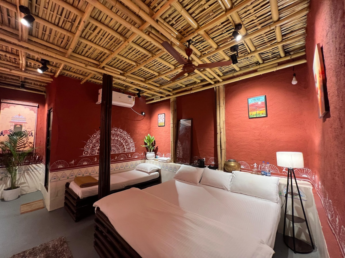 We provide aesthetic architecture with focus on hospitality, design and exquisite craftsmanship of mud and bamboo. Our theme represents Indian sanskriti and rich heritage culture. Our property from different locations statue of unity - 15km (15-20 min drive) poicha nilkanth dham mandir - 15km (15 min drive) Mandan lake - 12km (15 min drive) Barkhadi - 12km (15 min drive)