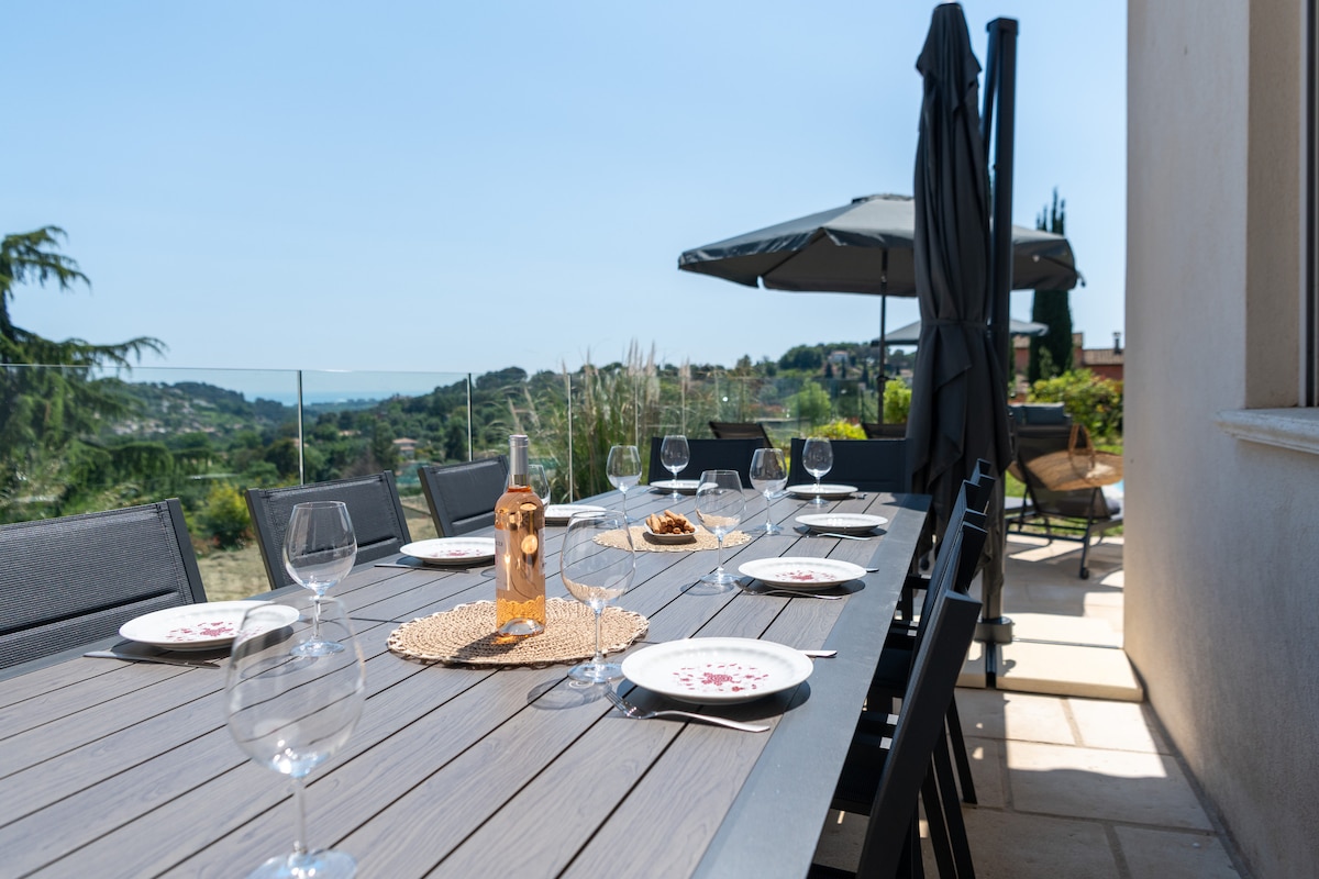 Villa Calade, sea view & village of Biot, welcomes you in a quiet and elegant setting close to Antibes and Cannes. Designed for stays with family or friends, the spacious and comfortable villa has 5 suites with a swimming pool that can accommodate up to 10 people with an outbuilding for more privacy. Cinema, Sauna, Fitness, Foosball, Pool house with pizza oven. Air conditioning. Free private parking. Noisy parties are not allowed in order to preserve the serenity of the premises.