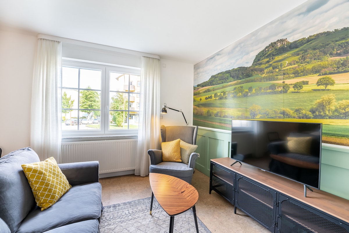 Our newly renovated apartment with a big flower garden is located in a quiet and nice residential area of Engen. You have a romantic view of the historic center. Radolfzell, Konstanz and Zurich are easy to reach by car or train. Numerous shops can be used without a car. In warm weather, it is worth to talk a walk to the Hegauer Area or to the Lake Constance.
