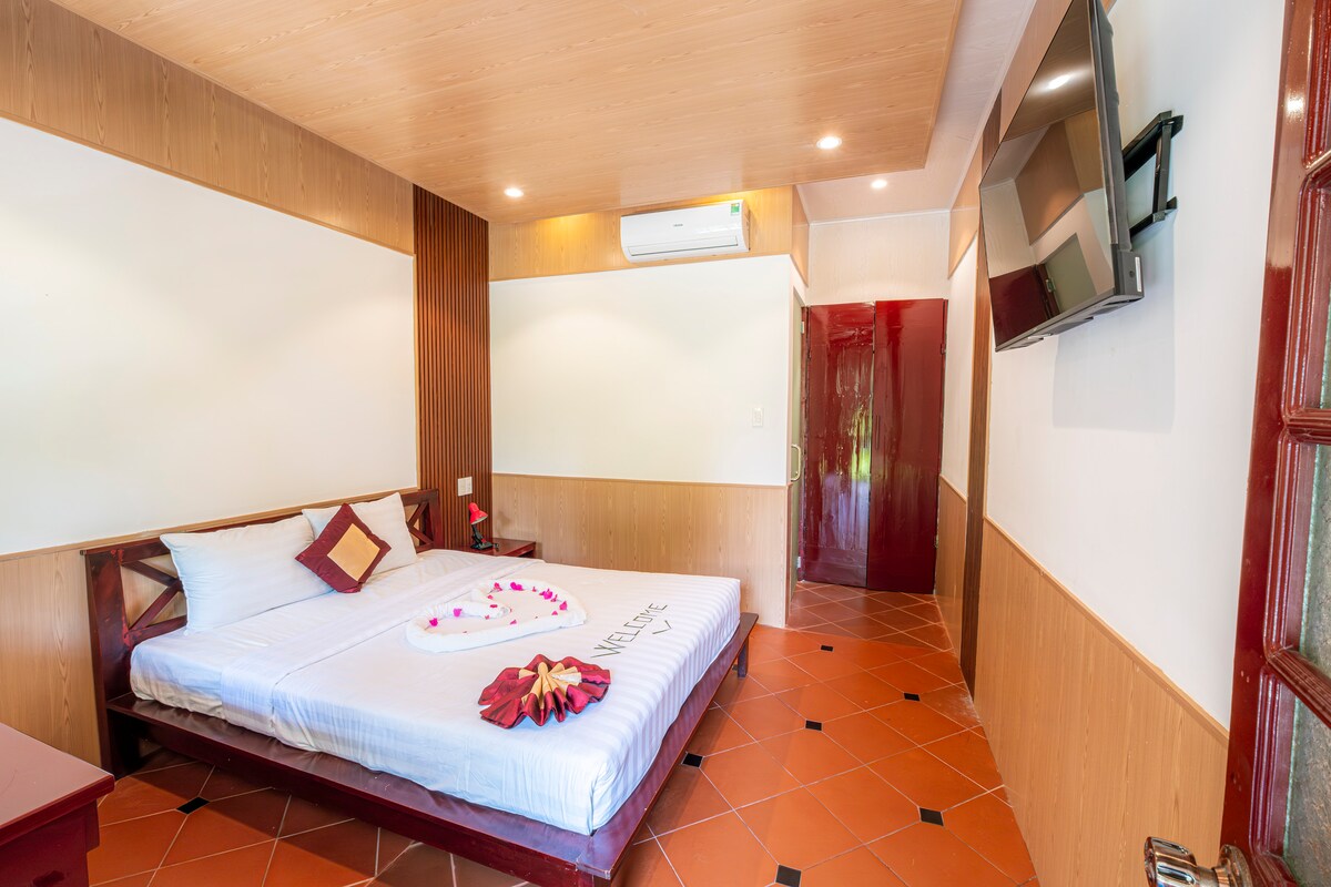 Không gian phòng có cửa kính lớn hướng nhìn ra biển xanh cùng nội khu 2 Phòng ngủ: 1m8 x 2m, nệm cao cấp Nhà vệ sinh khép kín: có vòi sen, bình nóng lạnh. 🍳 Khu vực bếp nhỏ Bếp tích hợp trong phòng, gọn gàng và tiện lợi. Có bồn rửa, bếp từ/một số có bếp điện, Trang bị ấm đun nước, ly tách trà/cà phê, dao kéo cơ bản. 🧰 Tiện nghi trong phòng Điều hoà nhiệt độ: TV Wifi tốc độ cao Tủ quần áo & móc treo Két sắt an toàn Bàn làm việc nhỏ Trà, cà phê & nước lọc miễn phí khi nhận phòng.