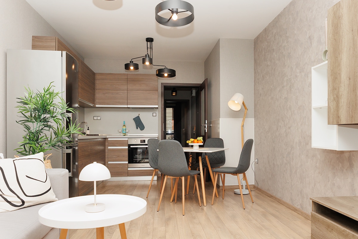 With a completely modern look, our one-bedroom apartment is now ready to welcome you! The elegant interior is carefully chosen to make you feel just like at home. The flat is fully equipped with everything you need either for your short or long-term stay. At your disposal is also a parking spot. Strong Wi-Fi connection is covering the entire property. The space is disinfected according to the Flat Manager Sanitary Standards.