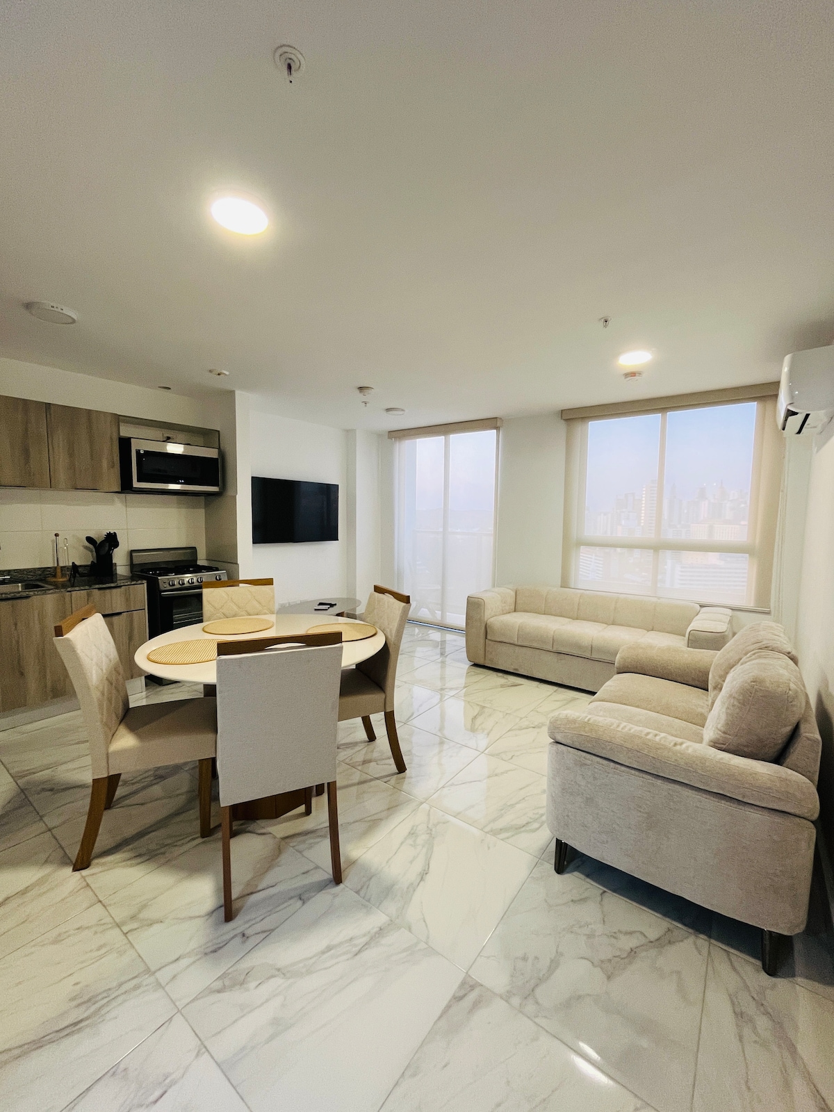 Enjoy a stylish experience in centrally-located Panama City. Cozy apartment located on 70th Street East, San Francisco, near the banking area, Omar Park, restaurants, pharmacies, etc. Fully furnished, it has (2) bedrooms, both with queen bed and A/C, one (1) full bathroom with hot water, living room with sofa bed, 400Mbps WiFi, with smart TV and cable (with hundreds of channels), kitchen (with all appliances) and laundry (washer and dryer).