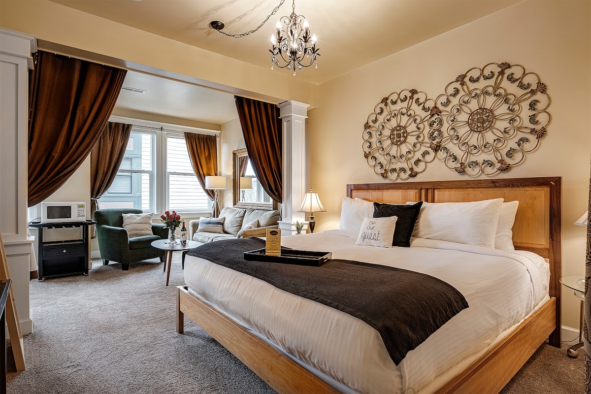 Historic Hotel Stevenson, boutique hotel built in 1909, Room 12. Ensuite with extra comfy king-size bed, views of Red Bluff, Keurig coffee maker, wifi, and Samsung smart TV to enjoy free TV or your favorite streaming shows. 77 Cork & Tap Bistro is an onsite cafe & lounge for hotel guests and visitors, serving small plates and appetizers along with beer and wine. Attached to the bistro is a private courtyard with outdoor seating and a gas fire pit.