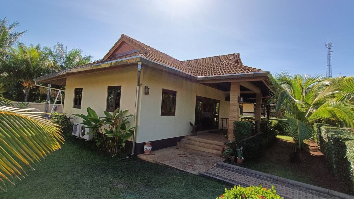 🌟Newly renovated pool villa near Krabi Airport (3km) 🔥Free Airport Shuttle -private pool villa -fit for 5people -2 car parks -big tropical garden -2bedrooms (2king-sized beds and 1 normal sized bed) -3bathrooms -fully equipped kitchen -living room with smart TV and sofa -pool table 📌This property is suitable for ✅those who have early flights or arrive late at night ✅those who have a car and want to travel both sides of Krabi (Aonang side and Emerald pool) as it is half way to both sides