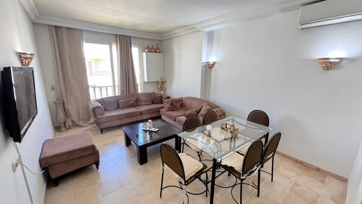 Bedroom + 2 apartment for rent in the middle of the Marina Yasmine Hammamet residence. The residence is 5 minutes from the beach and has an amazing view of the garden of the Russelior hotel, a swimming pool and a well-guarded parking lot. The apartment is on the second floor Sleeps 6. Contact: 54.568.101