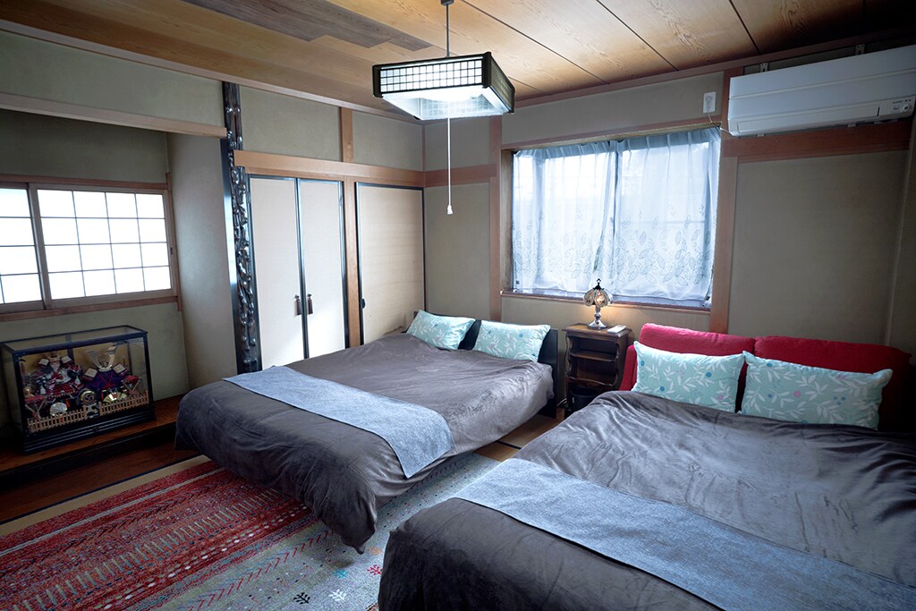 Tatami mattresses/3 beds/8 futons/Pick-up and drop-off service/1 km to the nearest station/3 bicycles/7 free parking spaces/Luggage storage/Wi-Fi/Dryer available