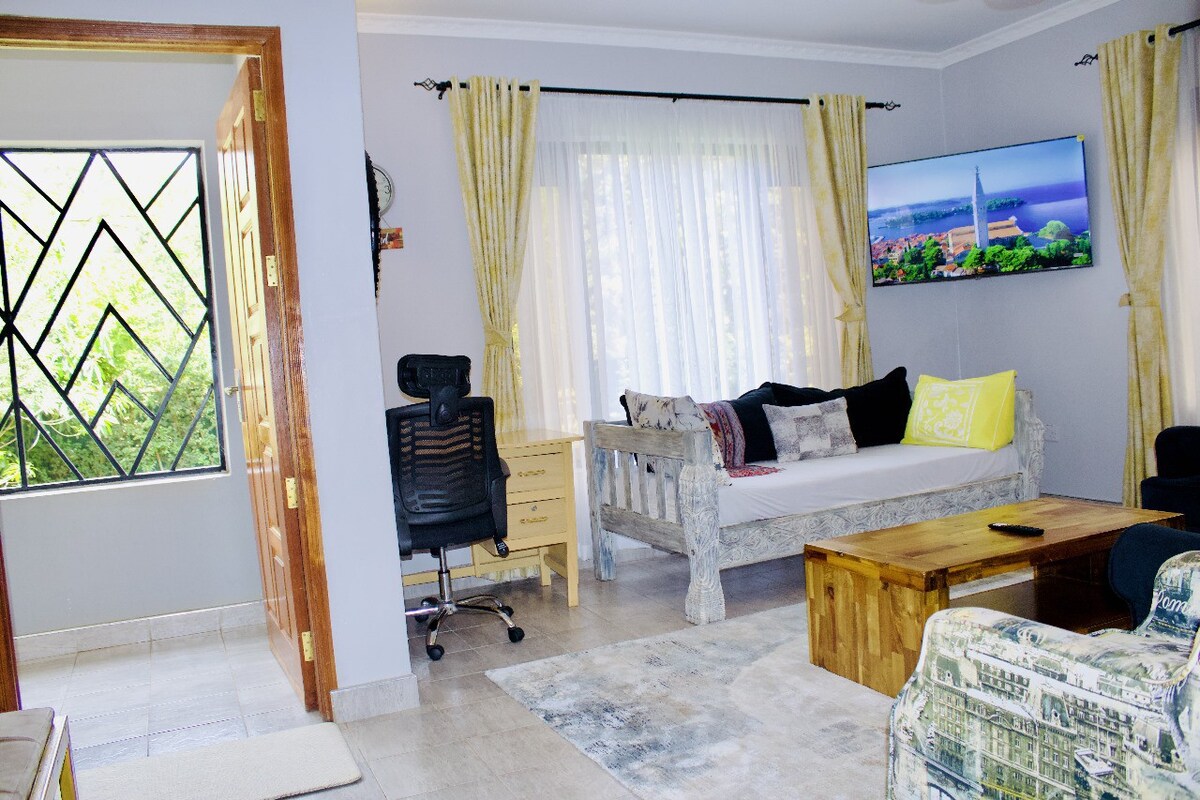 This stylish Kingfisher Cottage is a home consisting of spacious one bedroom unit in a large private compound with ample secure parking located off Kamiti Road along Mirema Drive.. On Mirema 1st Avenue It offers a manicured lawn with mature trees and outdoor spaces to unwind and enjoy tranquility. Ideal for solo travelers, couples or young families.