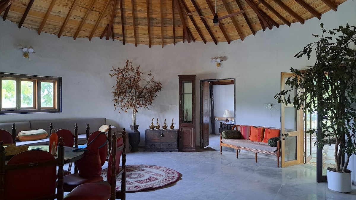 Privacy First: 4 large bedrooms 🛌, fully separated from each other in different blocks for complete privacy. Indoor Comfort: Huge gathering hall 🎉 & a spacious, well-equipped kitchen. Outdoor Luxury: Sparkling Swimming Pool 🏊 & relaxing Jacuzzi 🛁, plus garden sit-out areas. The View: Experience soothing, uninterrupted green farmland vistas 🌳 every day. Perfect Blend: Rustic comfort meets natural tranquility. Book your serene getaway now! ✨