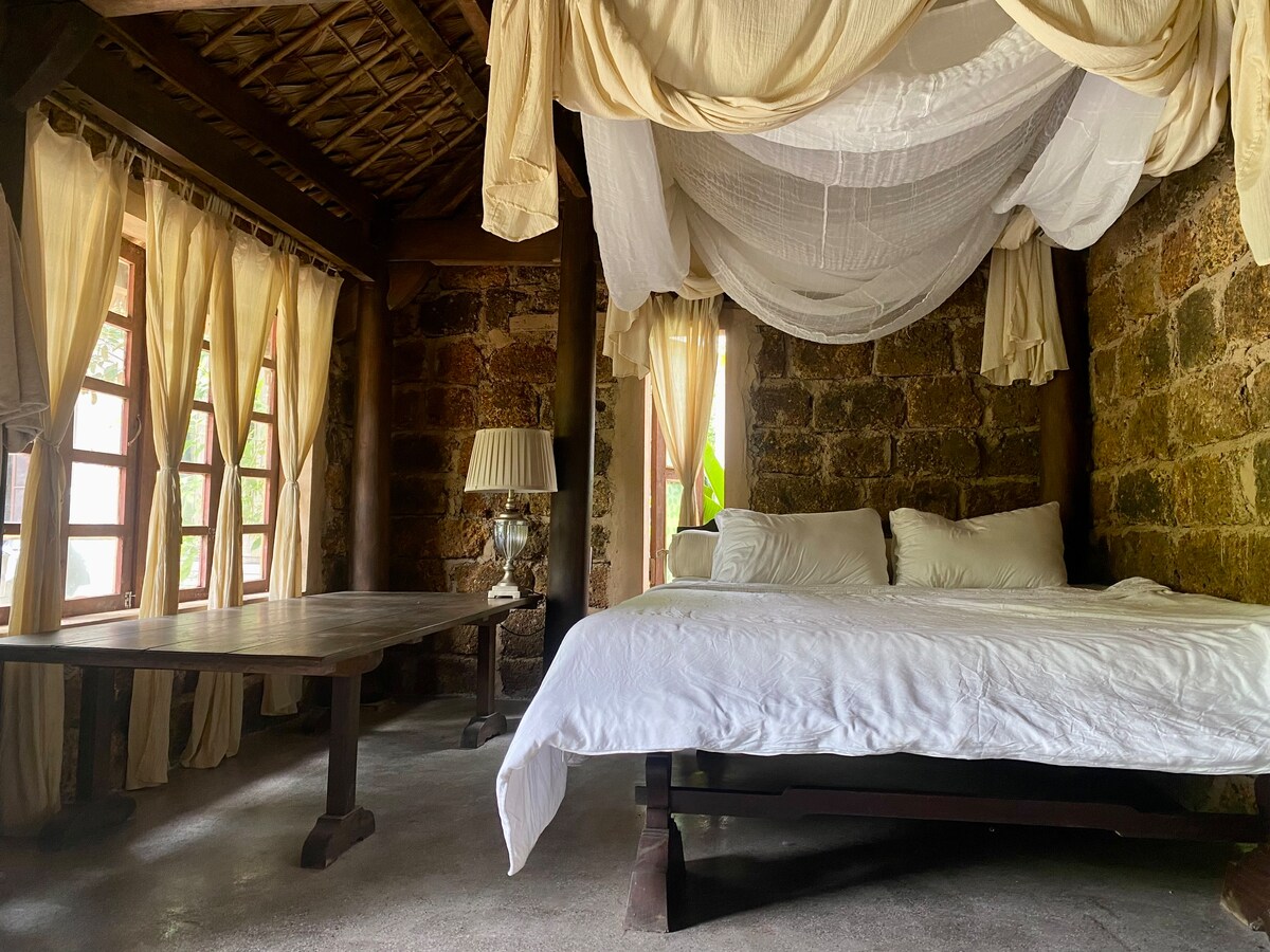 The Lychee Bungalow (natural laterite) is designed based on the inspiration from the hammock making village from hemp of the Tho ethnic group in Western Nghe An, a unique traditional cultural feature. The small sleeping area, large toilet and spacious porch full of sunlight and wind next to the bamboo hut, a place for yoga and meditation. Natural laterite material is good at soundproofing and heat insulation, helping the room warm in winter and cool in summer.