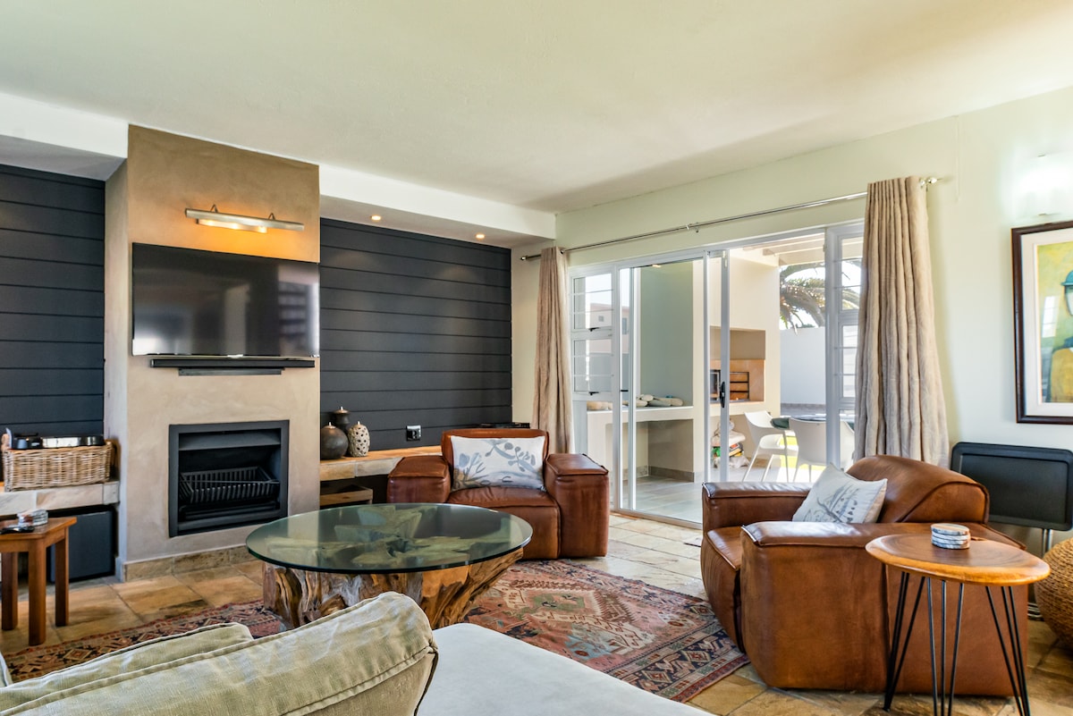 ● Sea-view from beachfront patio & 2 rooms ● Washer & Dryer with indoor drying line ● Full kitchen with Dishwasher ● 20Mbps reliable WiFi ● 3 Bedrooms all with on-suite bathrooms ● Cozy open plan living area with indoor braai ● Nespresso machine ● Ice maker ● 43" SmartTV with Netflix ● 2 parking bays - - in front of the garage - courtyard for a small car. NOTE: No parking in garage ● Family games ● No housekeeping services during stays