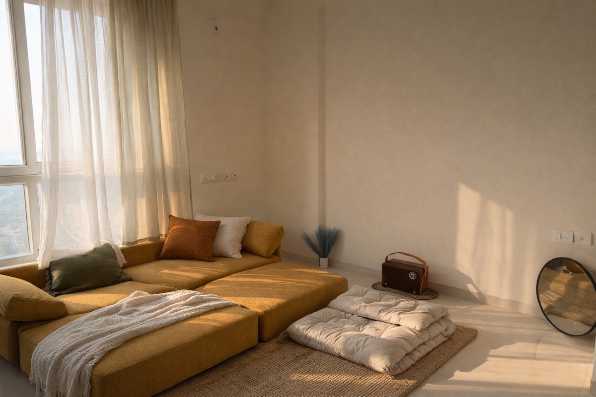 The Skyline Sunsets by Click & Space Located on the 18th floor, this warm and sun-filled apartment features a lush green balcony and a cozy, rustic living area that comfortably seats four—complete with a smart TV, Netflix, Prime, Hotstar, a soundbar, a compact coffee table, and an Xbox console (guests may log in using their own accounts). The overall vibe of the home embraces slow living in the heart of the financial district ,HYDERABAD