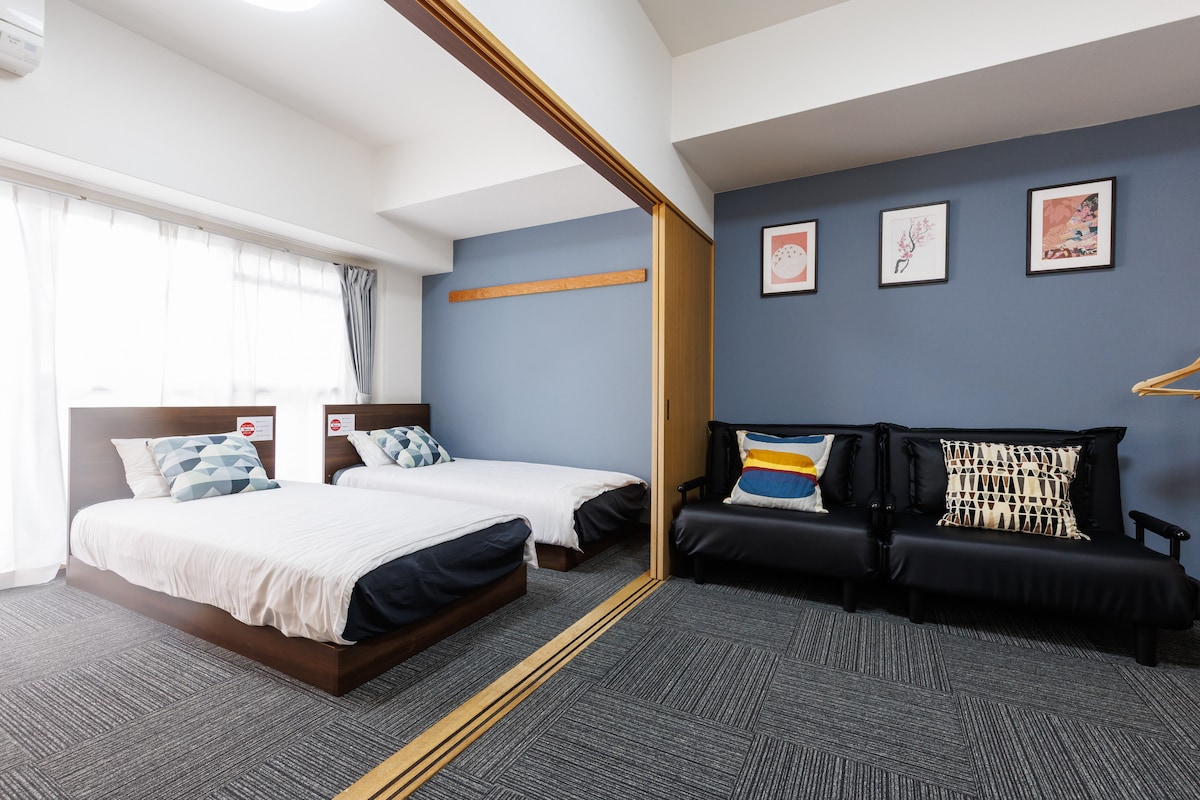 220m from Daikokucho Station, 1 stop to Namba/Shinsaibashi, straight to Umeda, entire apartment, 2 bedrooms, 5 people