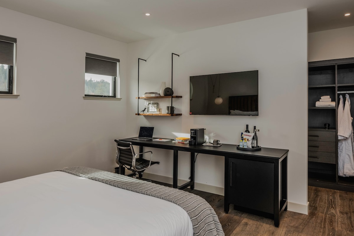 Experience the perfect blend of historic charm and modern style in our newly renovated deluxe king room. Relax in a plush king bed, enjoy a spa-inspired rainfall shower, and stay productive at the sleek work desk. With premium amenities like a mini-bar, Keurig coffee maker, streaming TV, and complimentary WiFi, your stay is both luxurious and convenient.