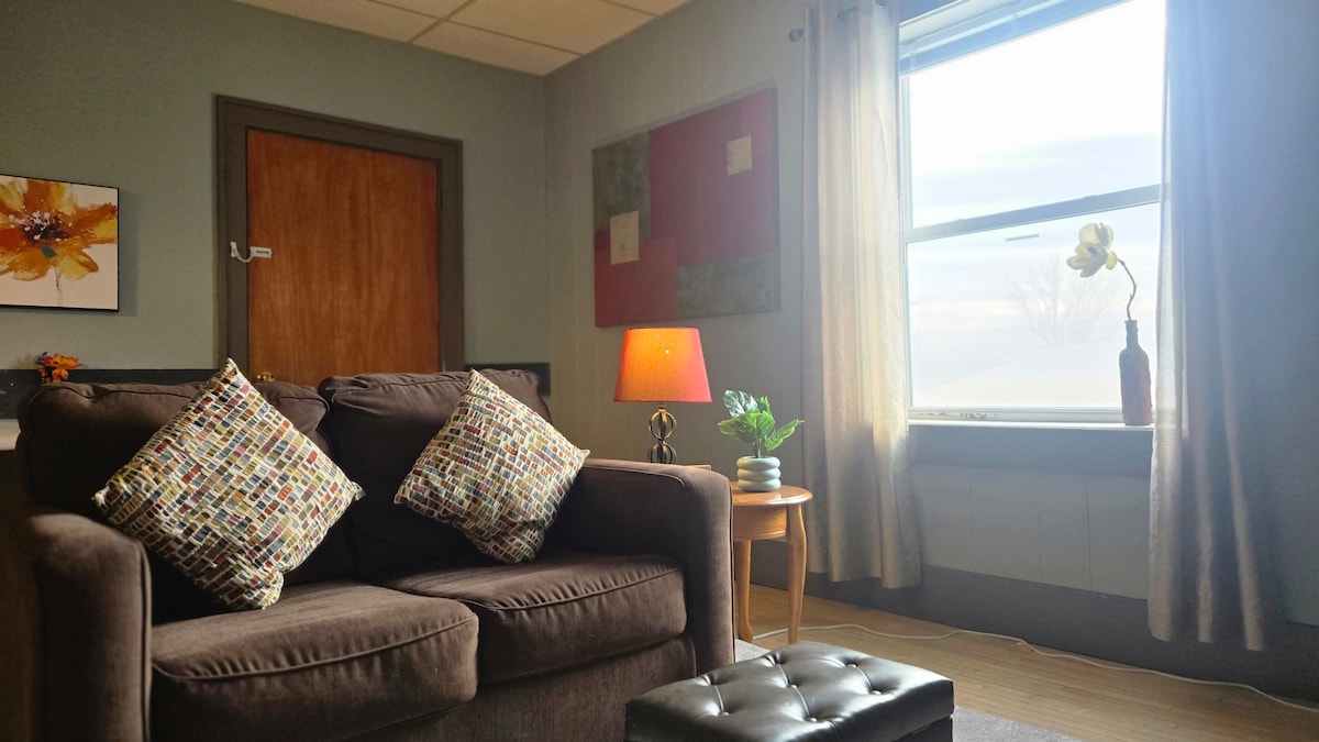 This apartment is on an upper floor, accessible via a 20-step staircase. Recently updated, Apt #2 has a bright bedroom with plenty of natural light, a cozy living area with 50" smart TV, electric fireplace, and a spacious dining table for two. The compact kitchenette features a rolling island and drop leaf for extra counter space & storage. The bathroom is very small but offers a full-size shower/bathtub. This unit is 1 of 5 private apartments in the building, each listed separately on Airbnb