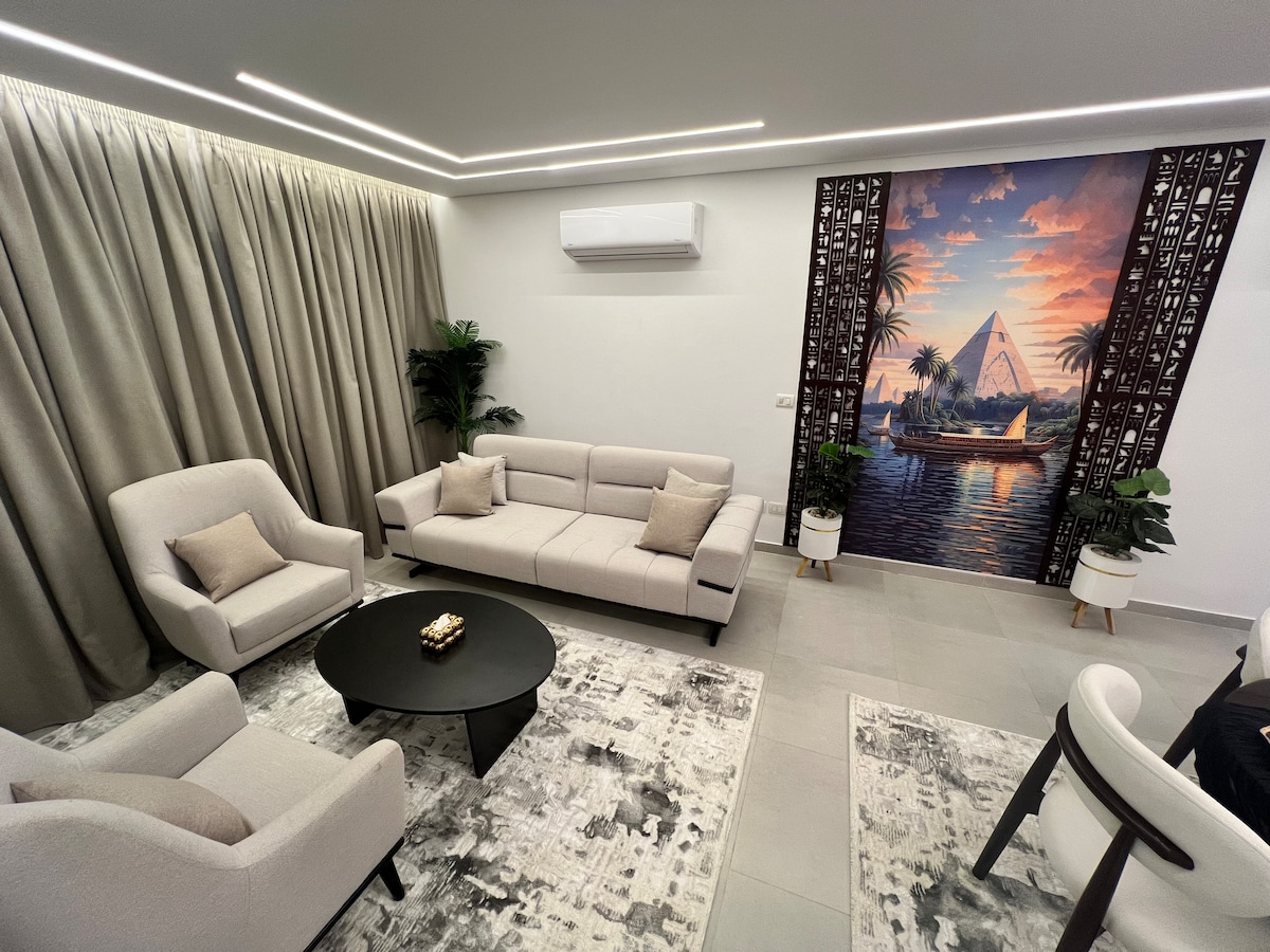 Enjoy the whole family in this stylish space. It is located in a special place in New Egypt and close to the airport, famous malls, restaurants, cafes, entertainment venues and is not far from the city center and archaeological places in the heart of Cairo. This place is also quiet and has all the services and has a large and equipped kitchen This space is prestigious, modern, stylized decor, beautiful colors, and equipped with hot, cool central air conditioning, and you can control with a lot of levels that fit all tastes
