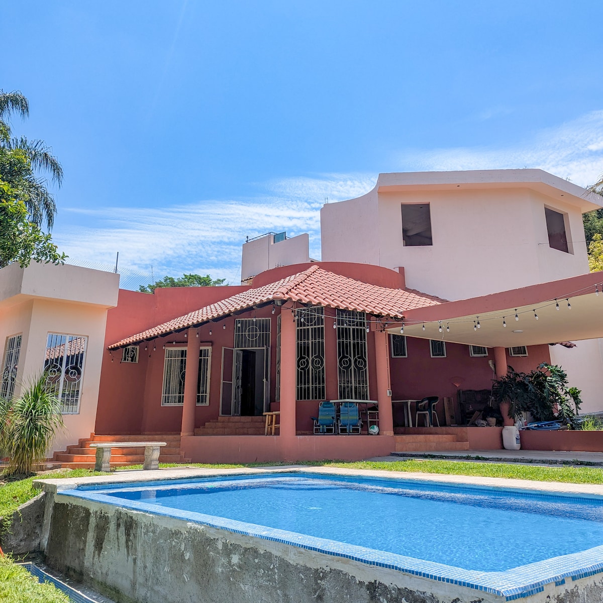 Casa Cactus is a cozy country house located in Lo de Lamedo, just minutes from Tepic. Perfect for relaxing with family or friends. Enjoy its pool, large patio, equipped kitchen and 3 comfortable bedrooms. Surrounded by nature, it is the ideal place to disconnect from the noise and rest in a quiet and private atmosphere. Due to the environment, it is possible to observe birds, squirrels, iguanas and bees in the gardens. Insects may also occasionally appear.