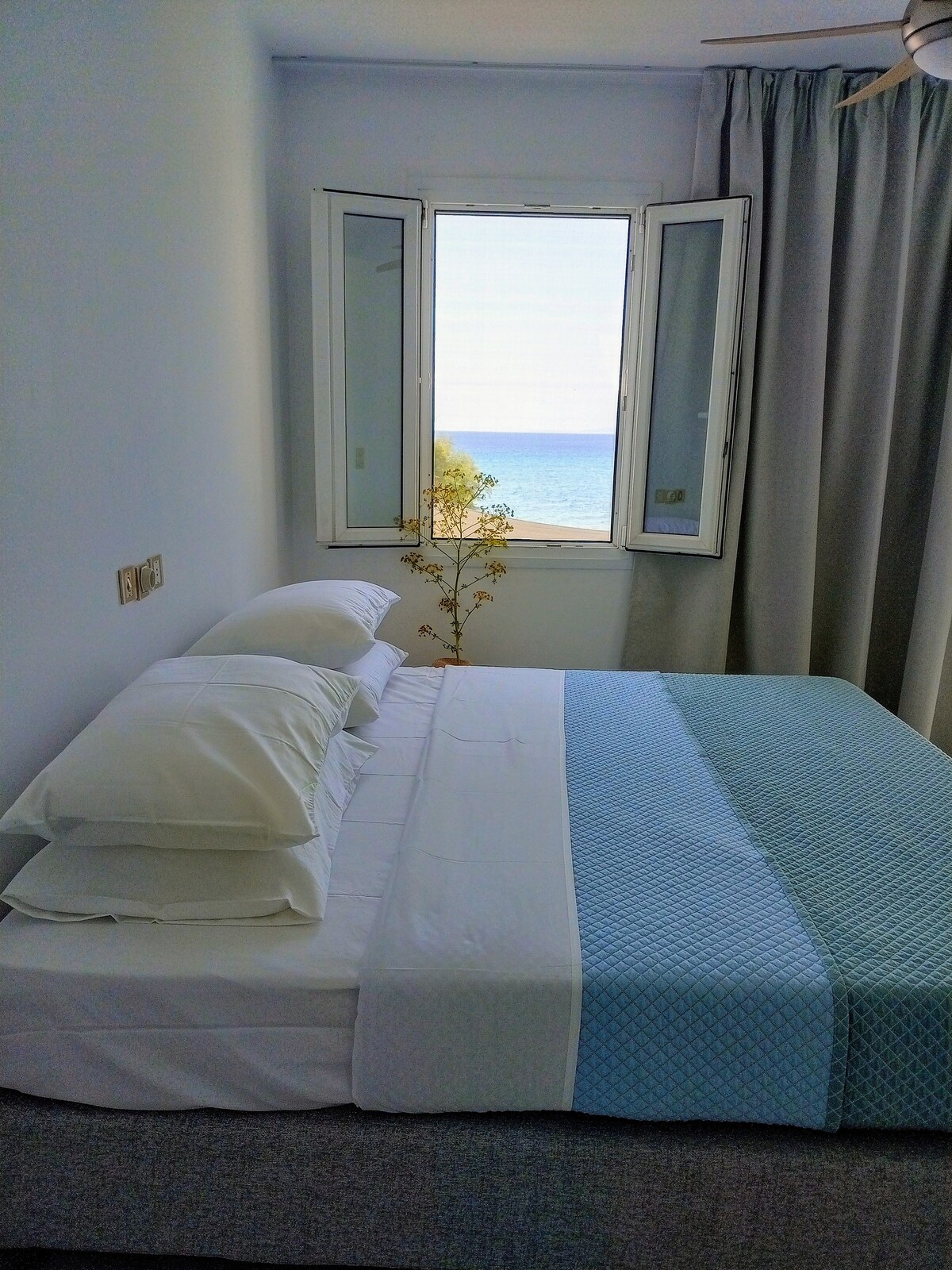 This is a cosy small studio with a beautiful view to the beach. It has everything a guest needs such as an air condition and appliances, cupboards, wardrobe, small bathroom with a window, a desk, chairs and a double bed . The guests can also sit in the front garden of the main house which has a bench and table if they wish. Wi fi, cable TV, Netflix and parking space are also provided. It is ideal for one or two individuals