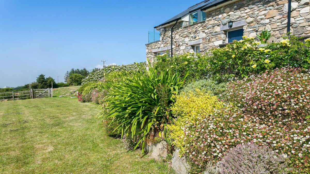 This home-from-home is a paradise for walkers, families and dog-owners. Its spa hot tub has amazing views of the mountains, countryside and coast. Brand new kitchen/dining room, bathroom and sunroom, all with underfloor heating. Spectacular views from all rooms. Superfast wifi, satellite TV and a dishwasher. Beautiful enclosed gardens and an easy walk to the village pub and shop. It's a great base for exploring the beaches of Llyn and mountains of Snowdonia. Workspace downstairs if needed.