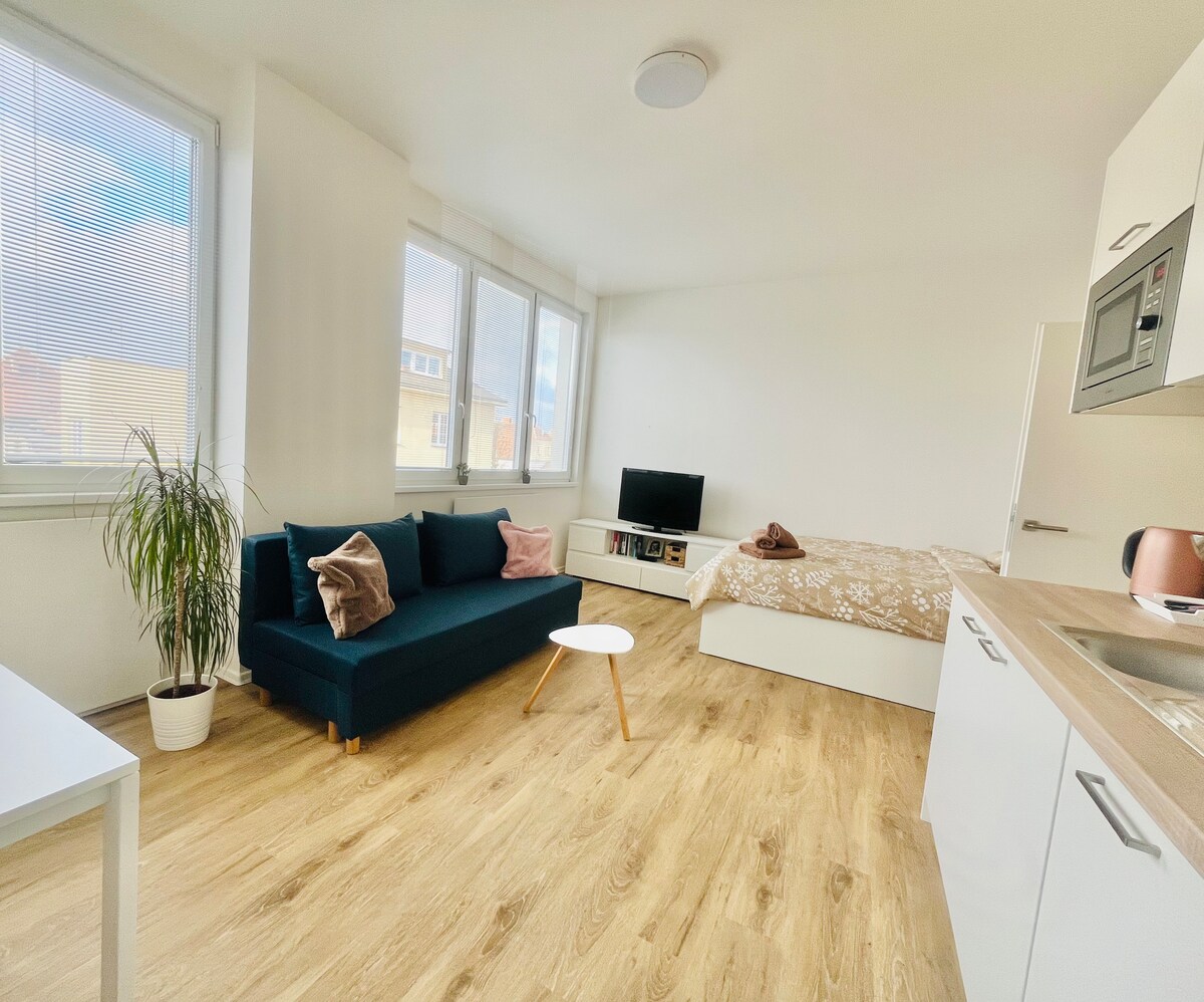 Nice and furnished apartment with a total area of 37 m2 with its own kitchen and bathroom. It is located in the wider center of Brno (about 10 minutes walk from Moravské náměstí.) The bathroom has a corner bath and a shower. The kitchen is equipped with an oven, fridge, freezer and induction hob. There is a TV, cabinets, a couch, an armchair, a desk, a coffee table). Free parking in the building (small and medium-sized vehicles can easily pass through the courtyard). There are prepaid Netflix and TV Watching apps.