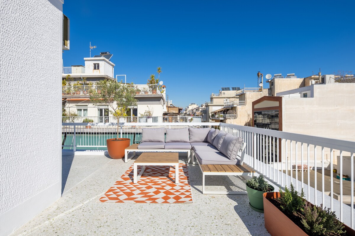 A stylish, bright and spaceous flat of the 1950's, close to Acropolis and Plaka, has been fully refurbished with respect to its initial elements and a bit of a modern twist. Located on the 2nd floor of a fully-owned two-storey building, it has a great view to Piraeus and Filopappou hill from its balcony and private roof terrace.