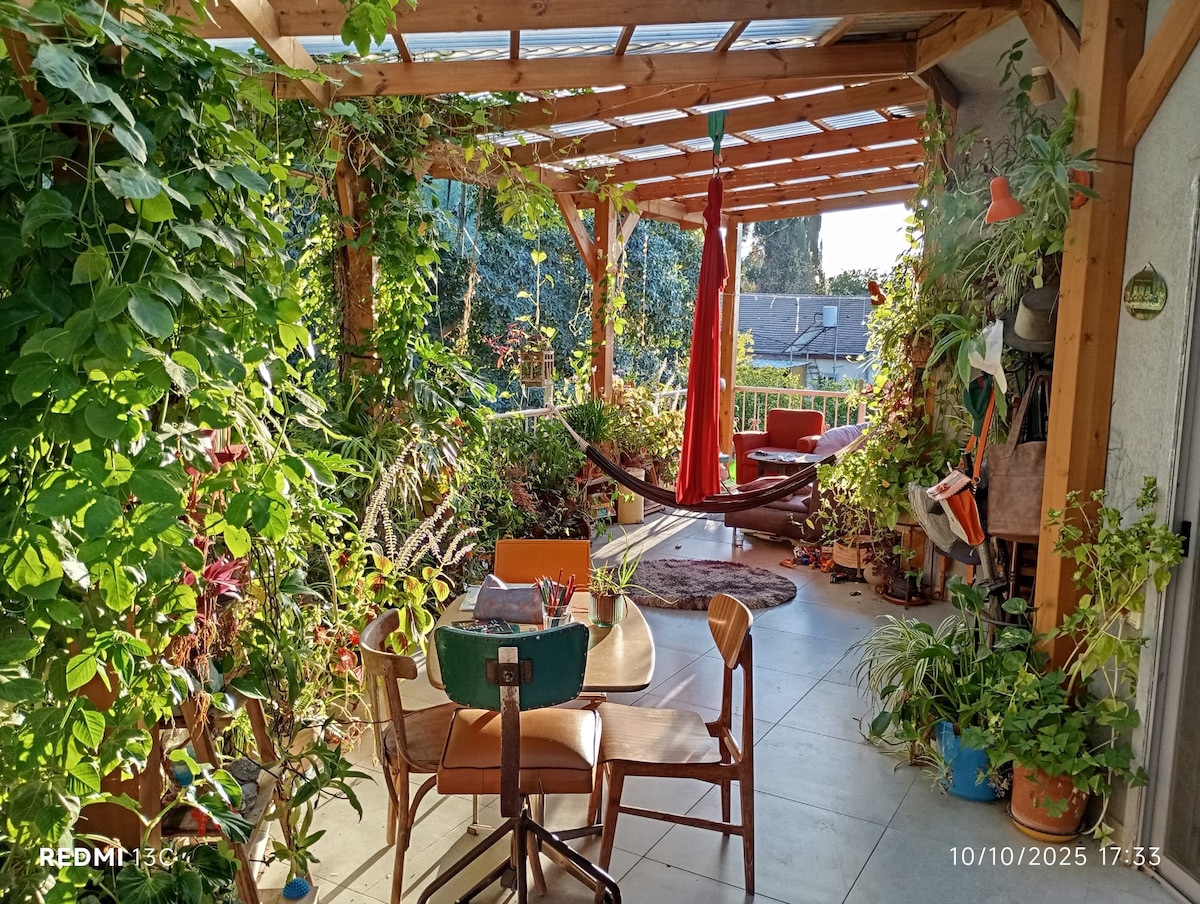 Stay in my luxurious 3-bedroom home in a quiet village in central Israel, featuring a 6-meter-high ceiling and a unique blend of upscale pop art and vintage decor. Enjoy sunrise views from the master bedroom and sunset from the panoramic terrace with a jacuzzi and outdoor shower. Includes a fully equipped kitchen, kids' room with bunk beds, safe room (mamad) with work and play areas, fast Wi-Fi, Netflix, washer, and dryer. Perfect for does who seeking comfort and style!