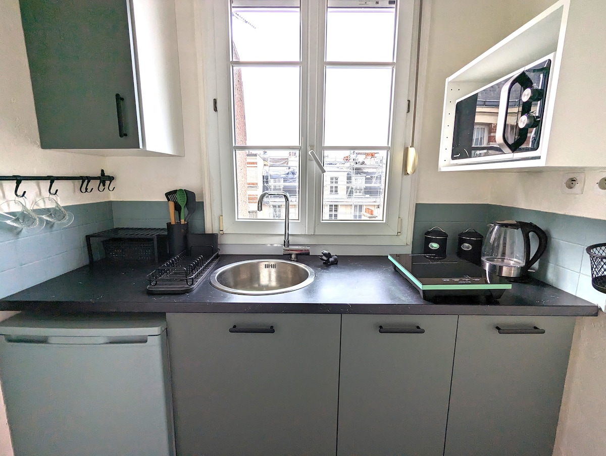 Optimised architect studio • Large private terrace of 6 m², incredible unobstructed view of the Eiffel Tower! • Sleeping area with comfortable bed (160x200) • Fully equipped kitchen area (coffee machine, microwave, fridge, dishes, etc.) • Modern bathroom with shower and toilet 7th floor with elevator / Very bright ✨ Absolute calm – secure building 1 min walk - Transport to M1 metro station "Pont de Neuilly" - Pharmacy, bakery, supermarket & shops /!\ Strictly forbidden: parties/evenings
