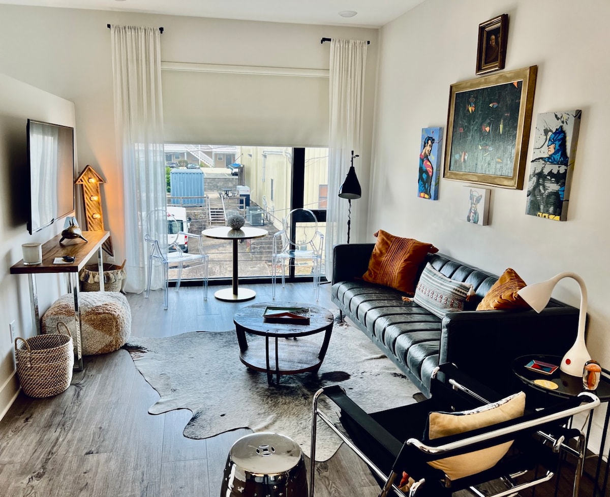 This uniquely curated king suite has large windows, visually captivating decor and original art, high ceilings, a beautiful full kitchen with quartz countertops and stainless steel appliances, comfortable living room and dining area, a large walk-in shower, and luxury linens. Together, the hip decor and art transform this suite into a visually captivating and engaging space to relax, providing guests with an immersive and memorable experience that goes beyond mere accommodation. Located in