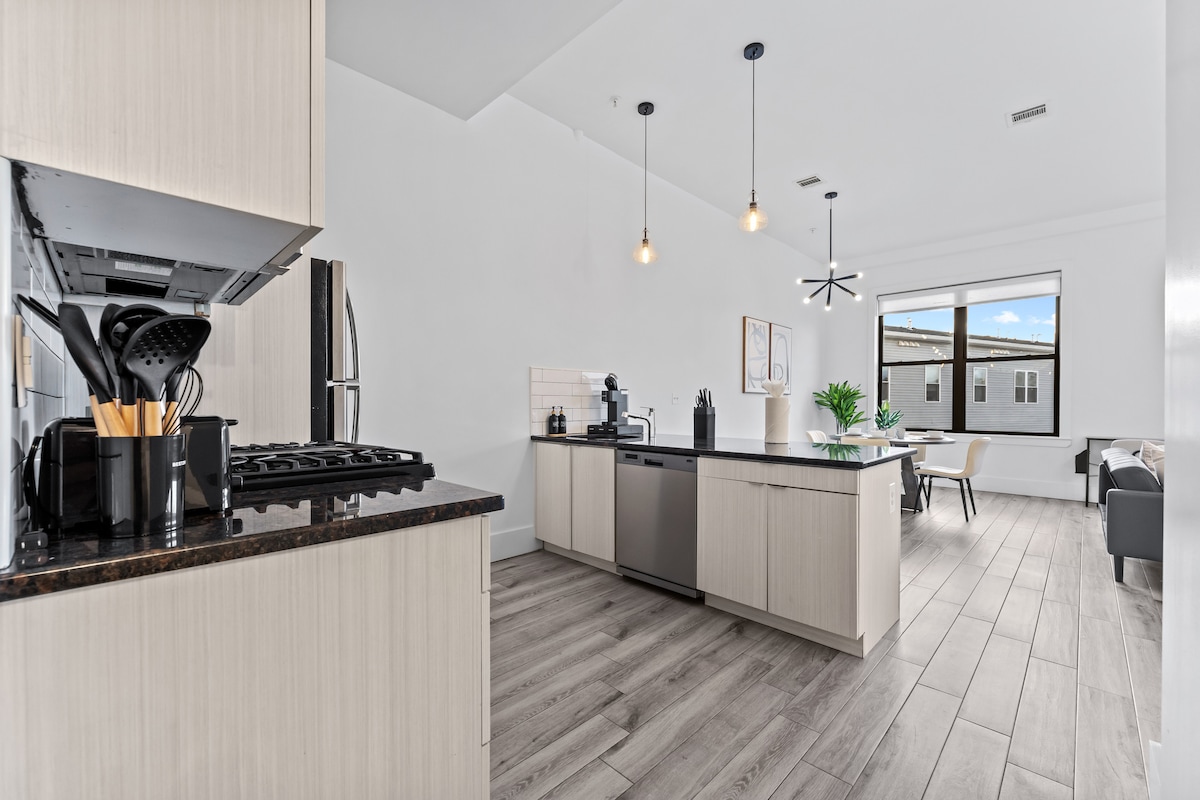 Stay at The Lofts at Kearny—a light-filled blend of classic loft character and clean, comfortable living. This 2BR loft features a sunny open living area, tall ceilings, huge windows, a master bedroom, and a bunk-bed room. With fast WiFi, washer/dryer, full kitchen, and workspace, it's set up for longer stays. Relax in the cozy lounge or head to the shared gym and outdoor terrace with grills. Right near NYC, with more room, more light, and way more calm.