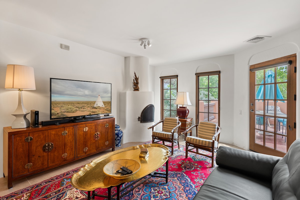 ✨ Romantic Sunflower Studio: peaceful spa sanctuary 🌲 1 mi to Plaza, 1.6 mi to Canyon Rd; off-street parking, private entrance, bath & fully stocked kitchen • 100% private hot tub (low-chemical) • Sauna + cold plunge spa circuit 🔥❄️ • Local chocolate truffles 🎁 • Projector for movie nights 🍿 • Organic coffee, tea & curated snacks ☕️ • Cozy robes • Mood lighting • Fast WiFi • A/C + heat • Green cleaning • 🐶 friendly ✨ Perfect for couples seeking a peaceful retreat minutes from the Plaza 🌻