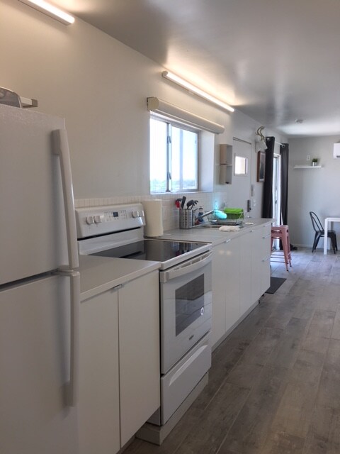 Modern shipping container home built with two 40-foot containers, fully furnished in a contemporary style with peaceful views and private driveway. One bedroom space, full kitchen with clothes washer & dryer, full bathroom (shower/toilet/sink), living room with sofa bed, dining table/chairs and small work desk. Adjacent private patio with pleasant views. LED lighting throughout, Wi-Fi Internet & TV, near bike path & downtown. Pet-friendly, please see House Rules for details/cost.