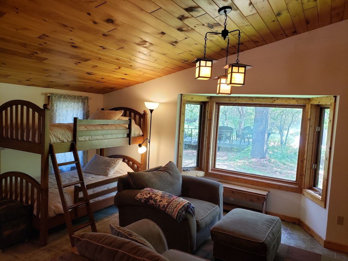 This family-size, fully-enclosed suite with a separate entrance from the host's attached house offers all the comforts of home within 15 min. of Minocqua, Rhinelander, and premier outdoor experiences- hiking, biking, fishing, boating. Inside find bright spaces, full log beams, and a hobbiton feel; open concept living area with fully stocked kitchen, table, bunk beds, large couch, TV and Wi-Fi; bedroom with queen bed and stowed air mattress; full bath; play room. The entire suite space is yours.