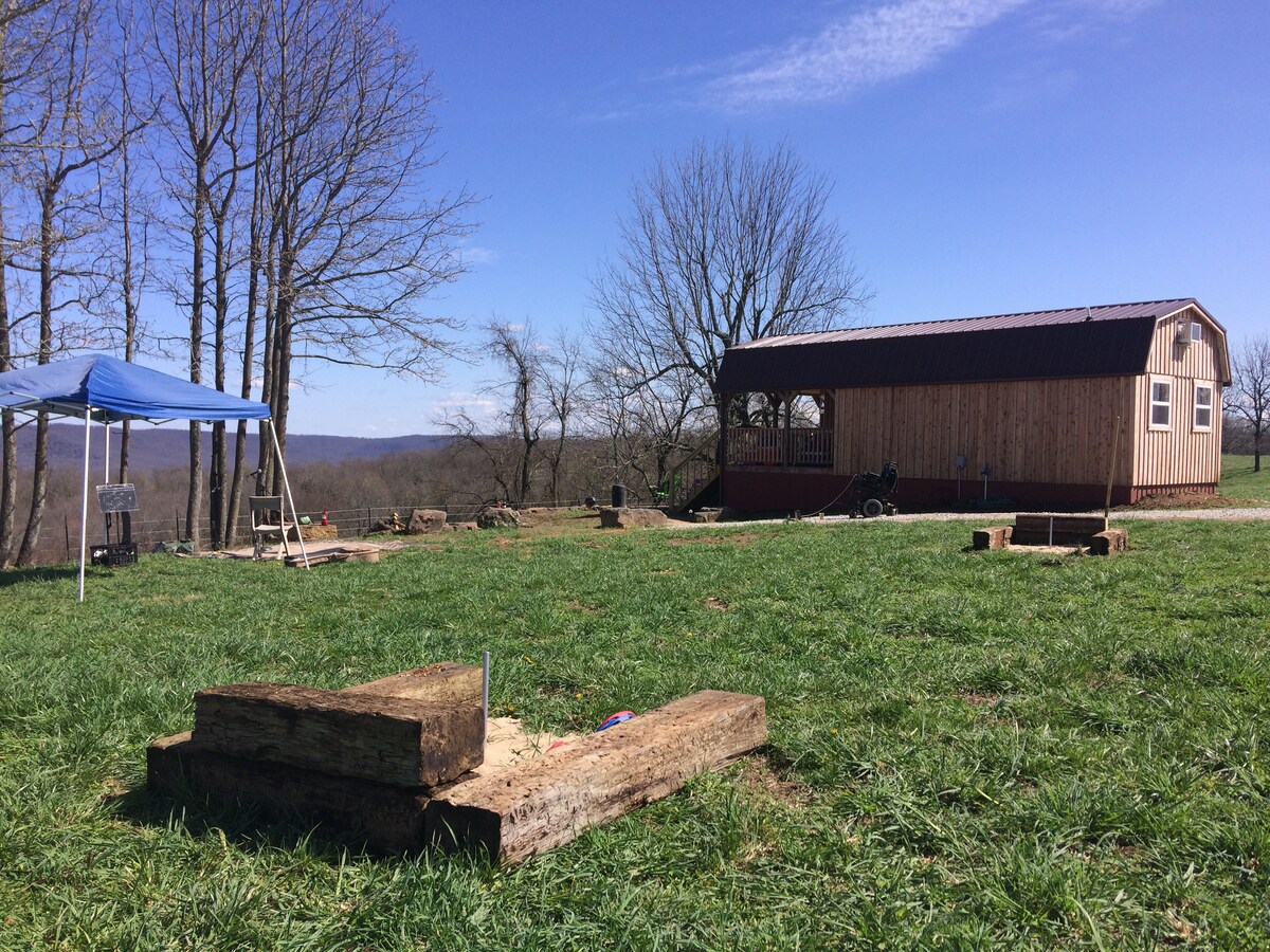 Enjoy this cozy cabin nestled in the heart of the Ozarks. With a view of Lost Valley and beyond, the front porch is a nice place to relax and unwind! With a full kitchen, fire pit, horseshoe pit, charcoal grill, and more we wish you to be able to vacation deliberately, comfortably, and affordably! Please hit us up with any questions and thank you! We do have Pyrenees dogs who watch over the farm, they are harmless and just part of the landscape. Firewood for sale, 5$ an arm load!