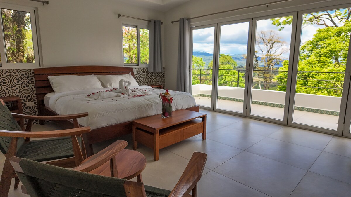Our quadruple room is a spacious family-style bedroom featuring twin-sized bunk beds, ideal for up to four guests. The room includes nightstands, a ceiling fan, individual closet storage, and a safe. Guests have access to shared bathroom facilities with private showers, toilets, and ample sink space. A shared living area with a TV and a full kitchen opens up to a stunning covered veranda, complete with cozy couches, plenty of space for yoga or relaxation, and breathtaking mountain views.