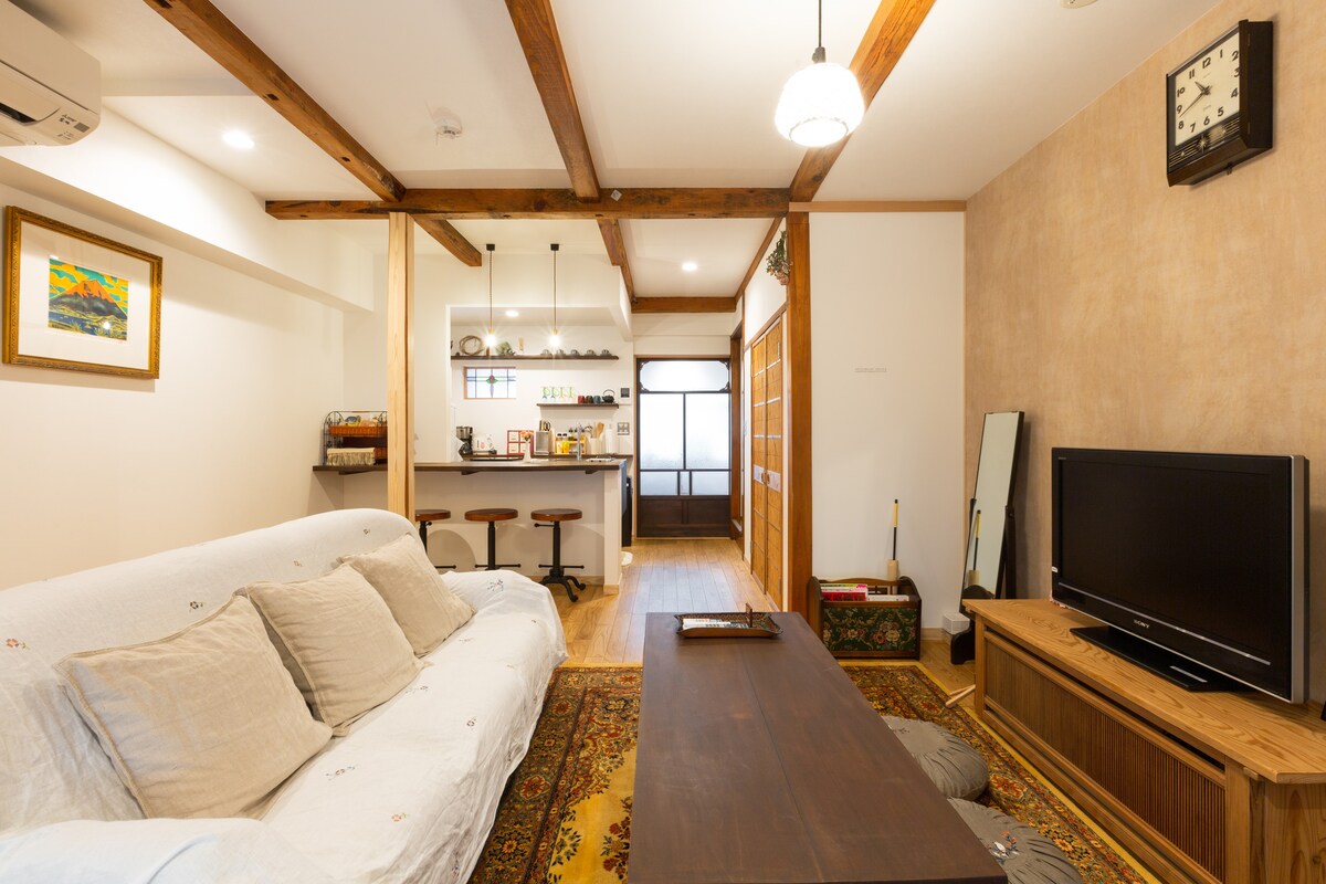 京町家貸切宿「高瀬川七条」は築115年の京町家をフルリノベーションした宿泊施設です。京都の美しい風景を形作る京町家を、当時の構造を残したまま、京都特有の蒸し暑い夏、底冷えの厳しい冬にも快適にお過ごしいただけるよう、気密性・断熱性能の高い建物に仕立て直しました。 1階の和室からは『露地』(※茶室へ通じる庭)をイメージした坪庭をご覧いただくことができます。また、廊下にはゆったりとくつろぎながら坪庭を眺めることができるようソファをご用意しました。夜にはライトアップされた坪庭を眺めながら、癒しの時間をお過ごしいただけます。 2階には寝室が2部屋あり、シングルベッド2台の部屋とダブルベッド1台の部屋をご用意しました。 5名様以上でご宿泊の場合は、少しご面倒ですが1階の和室にお布団を敷き、寝室としてご利用いただきます。 キッチンには簡単なお料理ができるよう調理器具と食器のご用意がございます。