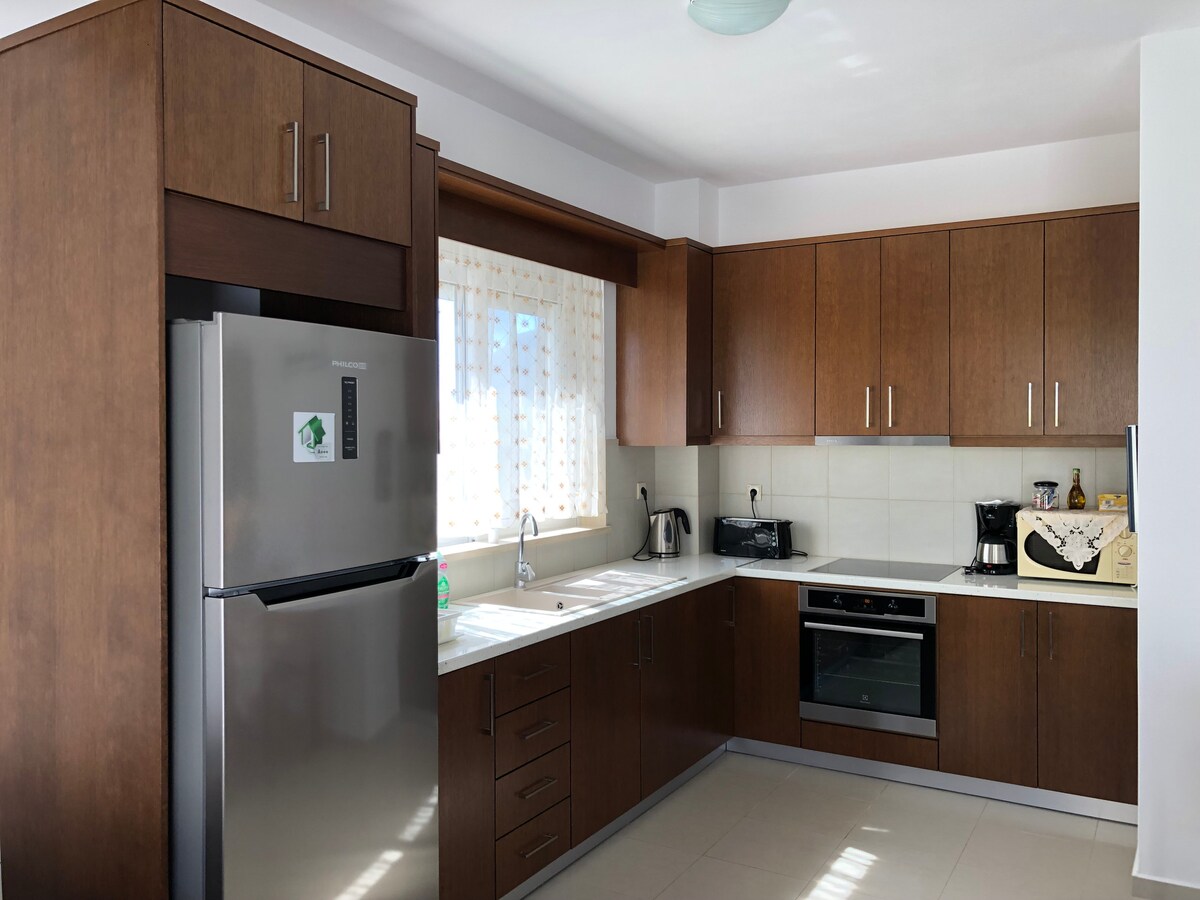 apartment with modern rustic appearance! 2 large bedrooms will give you the ultimate rest for your vacation! Enjoy our clean beaches which are located on each side of the island... their distance is only 5 minutes by transport and a little further if you want to see the sunset Don't have a vehicle? It's okay. The bus station is a 2-minute walk away. There is free parking in the area The airport is just 15 minutes away from the house