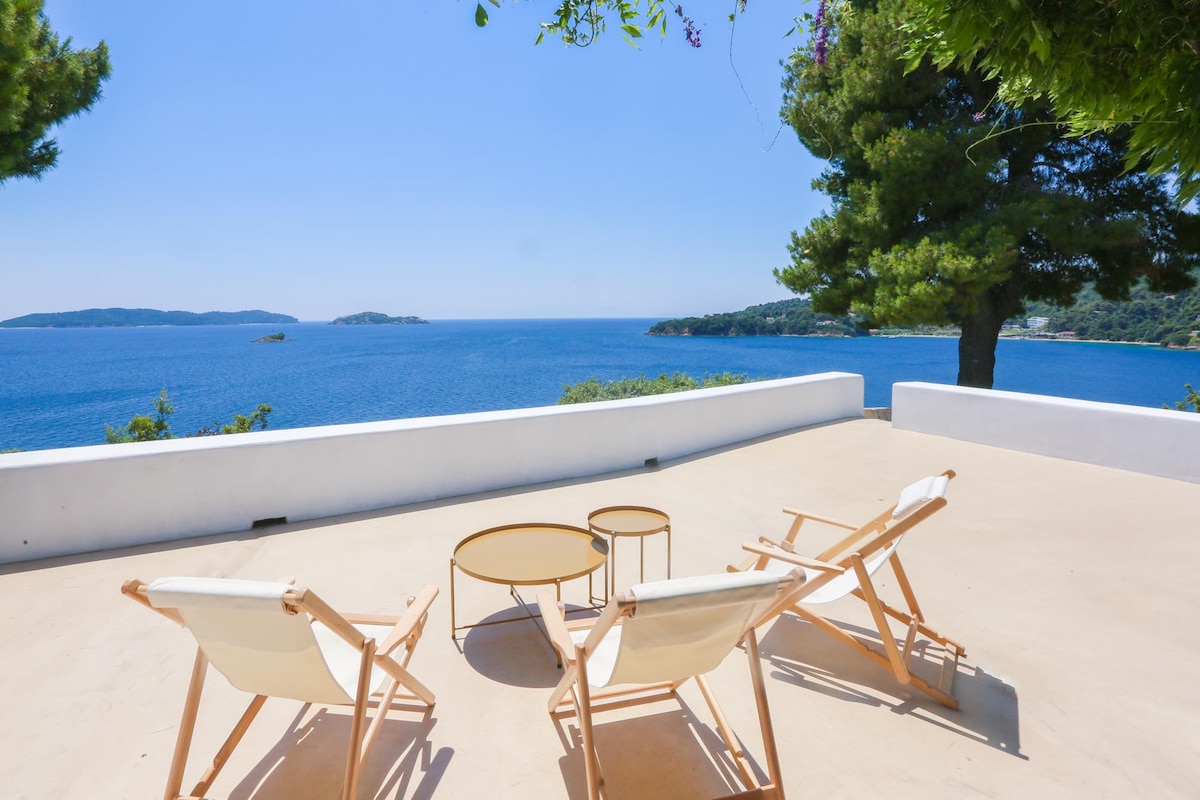 The fully renovated three-story Villa Skopelita offers a double bedroom, a twin bedroom with two single beds, and an extra single sleeping option via a pouf bed in the living room, ideal for a child. It includes two bathrooms and a bright living area. Highlights include its unique style and a spacious patio with breathtaking, uninterrupted sea views. Due to its location and overall buety, Villa Skopelita, is one of the island’s most photographed homes!