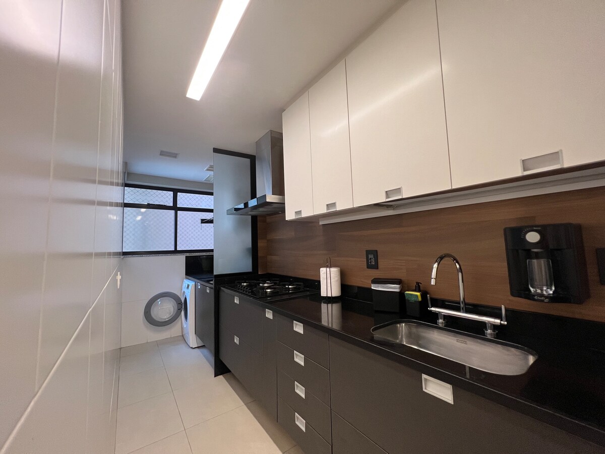 Ideal for those looking for style with sophistication and lots of comfort! King bed, socket, USB and reading lamp on both sides 75" Smart TV Very comfortable sofa bed Gourmet Balcony Ceiling fans 24000Btus air-conditioning Full kitchen Double water flow shower Wardrobe with 3 doors and full-length mirror Drinking water filter (kitchen faucet) Induction stove Laundry in the building 500 MB Internet Bed and bath linens (Hotel Standard) Newly assembled - Start Oct/24