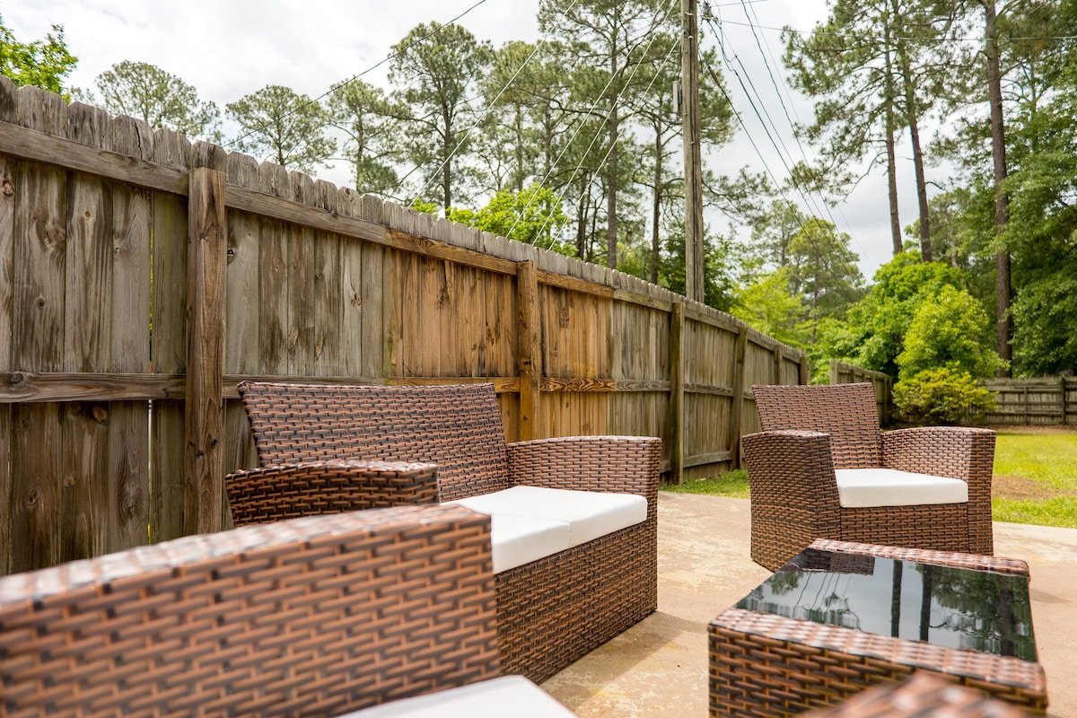This is a wonderful 2000 sq. ft. 3 BR / 2 bath house with a den, LR, DR, Kitchen and laundry room plus a full front porch with a swing and rockers, a back deck and pergola with seating and swing, and a 2 car carport and gravel driveway on 5 acres surrounded by a loblolly pine tree farm. We have high speed fiber internet/WIFI. We have 3 smart TV's with a DVD player and board games, as well. Our kitchen is well stocked for most cooking needs.
