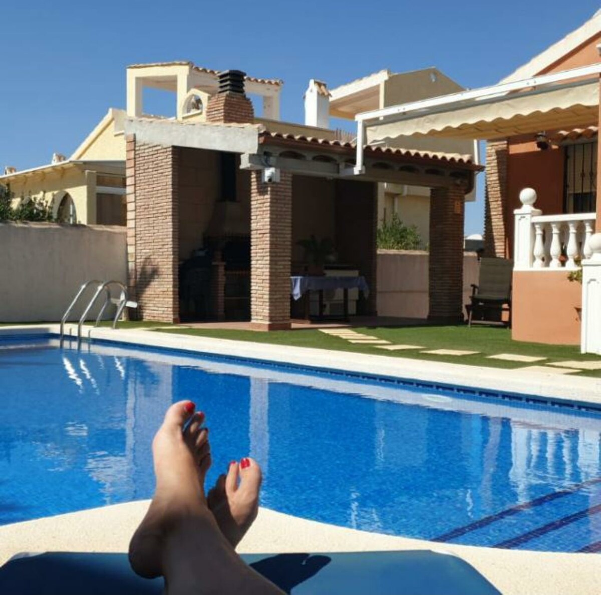 Bring the whole family or friends to this great place with lots of room for fun. We have 6 spacious rooms, 3 bathrooms, a swimming pool with a children's pool and chill-out area, an outdoor area with a large capacity pergola, a barbecue, a large independent celebration room, ample mountain views, a very quiet area, and free parking.