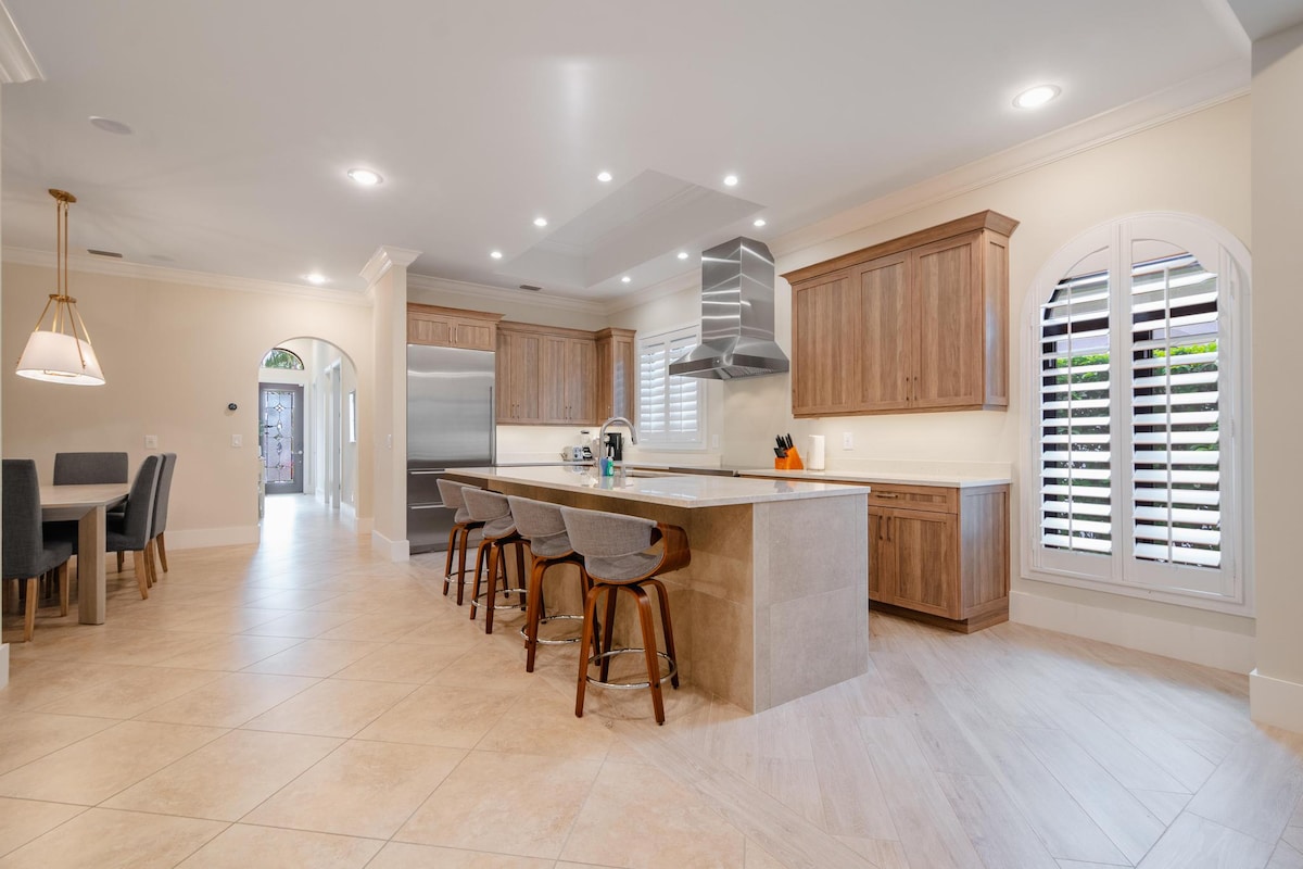 Escape to this brand-new luxury home with new furnishings in Naples, near beaches, restaurants and shopping. * 4 bedrooms, 2 king beds, 1 queen, and a fun bunk bed setup, 2.5 bathrooms * Chefs kitchen with all the amenities * Game room * Heated saltwater pool, hot tub and outdoor kitchen * Crib, highchair, toys and books * Vanderbilt Beach is 3 minutes away * The Mercato - great restaurants and shopping less than a mile away * Vanderbilt Pickleball and tennis center less than a mile away