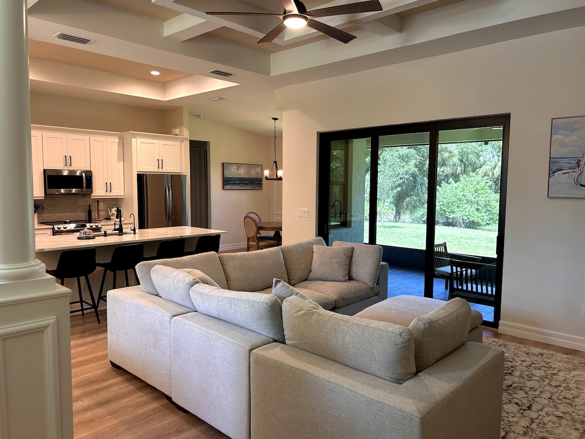 Big heated pool is private from neighbors. Full sun on the pool from noon to sunset. Covered lanai provides relief from the sun. BBQ & watch football on outdoor tv while the kids swim & play. Enjoy beautiful sunsets overlooking a peaceful park-like setting. Walk the golf cart paths, work on your tan, read a book, play music, sip on tropical drinks & float all your cares away. Have your morning coffee outside & listen to the birds sing. Outdoor living is what it’s all about here.