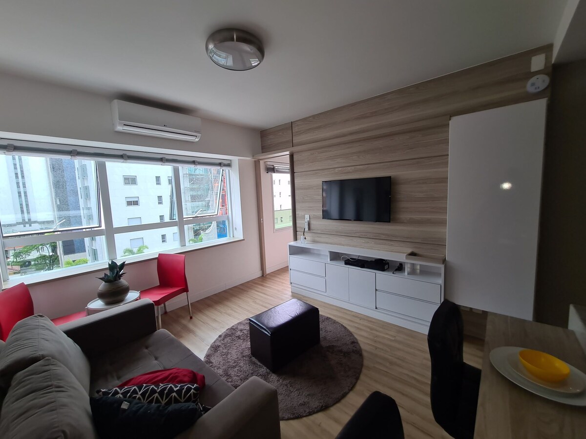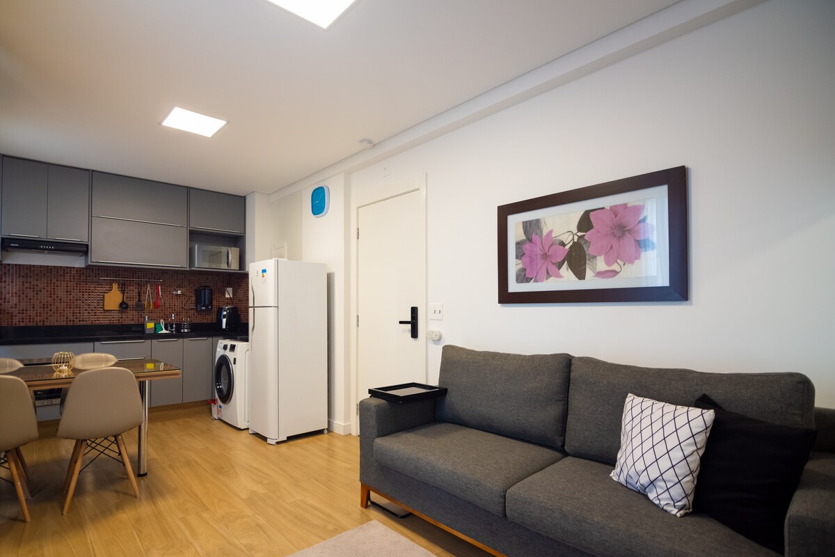 Flat confortável c/ mobiliário novo. Cozinha e sala integradas c/ sofá em L, mesa de trabalho, bancada c/ cadeiras, cama queen, ar condic. no quarto. Fornecimento de berço e banheira c/custo adicional. Cozinha equipada c/ cooktop, coifa, forno elétrico, microondas, geladeira, cafeteira nespresso e de coador, liquidificador, misteira e utensílios domésticos. TV SKY c/ 283 canais, wi-fi velocidade 500mb grátis. No bairro há vários supermercados, farmácias, cafeterias, restaurantes e shoppings.