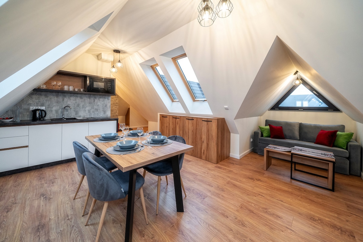 Our apartment is an oasis of modernity and comfort, providing an unforgettable experience during your stay in Białka Tatrzańska. Crossing the threshold of the apartment, you will find a living room, connected to a functional kitchenette, where elegance and functionality combine into a harmonious whole. The spacious living room invites you to relax after a busy day, and a fully equipped kitchenette allows you to prepare dishes at any time.