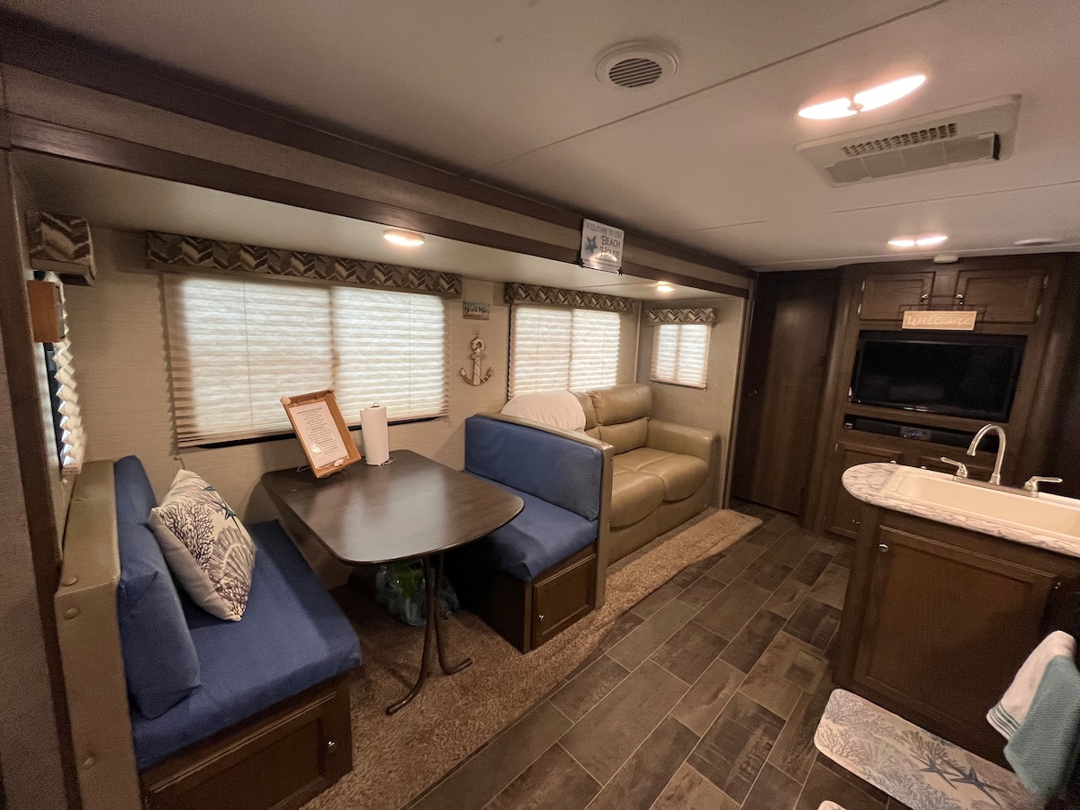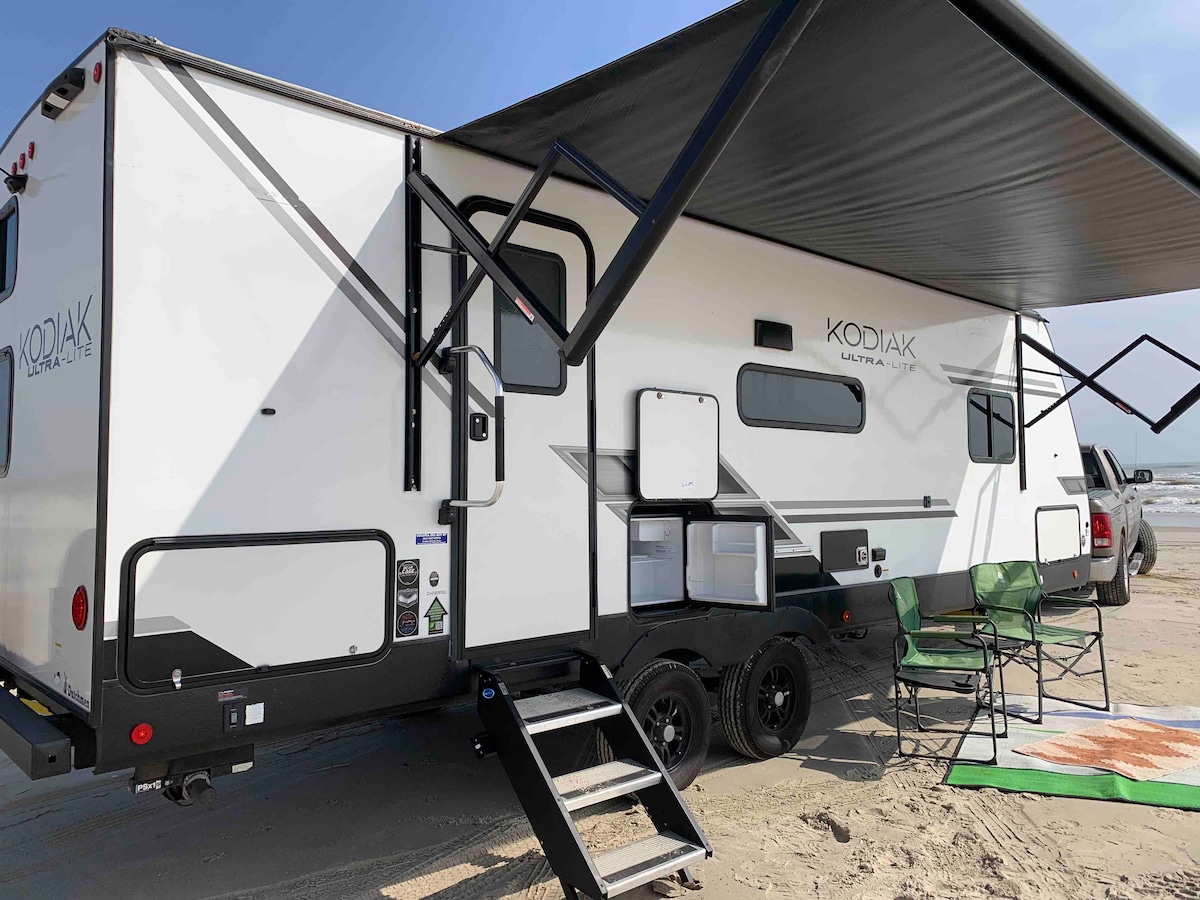 Kodiak Light Travel Trailer pulled easily by most tow packages or delivered to your destination. Sleeps 6 with private queen bedroom, 3 closets, storage under bed, USB stations, 2 smart TV's, 2 full size bunks with storage, & dining nook. Camping on beach not available, RV Park reservation required. Add Ons: Delivery = $150 up to 100 miles Pet Fee = $25, No Large Breeds Gray/Black Water removal = $30 per dump Grill = $30 (Includes grill, griddle & pizza oven) Sway Bar/rearview camera = $50