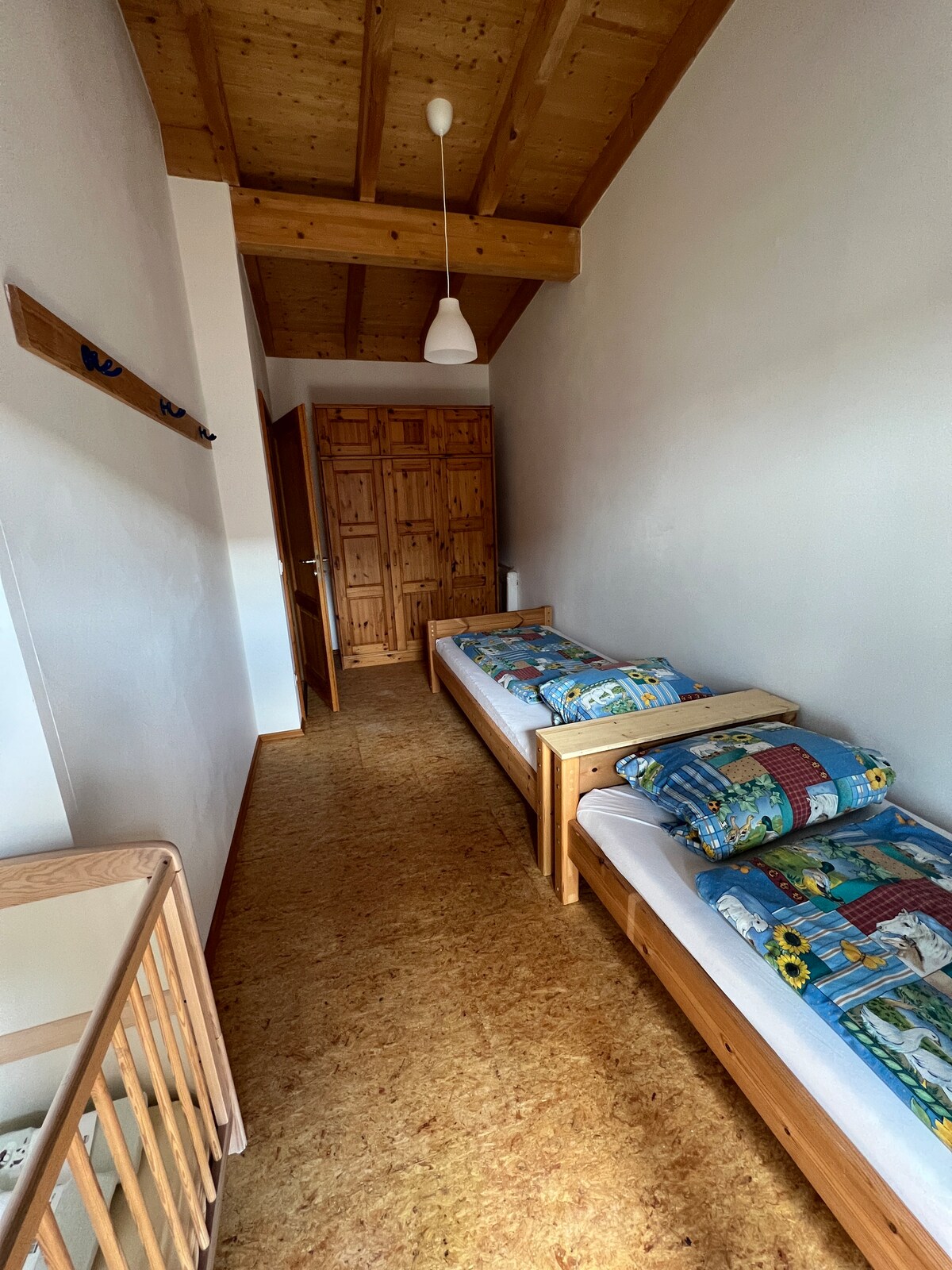 Small, open-plan apartment/granny flat on the ground floor with fitted kitchen (coffee machine, toaster, kettle, fridge with freezer), bathroom (shampoo, shower gel, etc.) with shower and toilet, towels, bed linen, hairdryer. Bedroom with wardrobe, living room with sofa bed, dining table, TV. Please let us know if you want us to make the sofa bed. Families with children are very welcome, there is a high chair available as well as various toys.