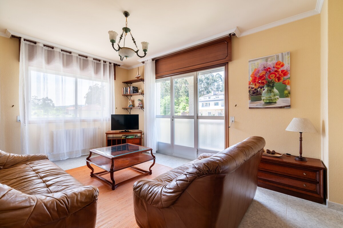 Our apartment is very spacious. It has a room with a double bed and bathroom included, a room with a double bed and another room with two beds of ninety centimeters each, it has a huge kitchen, a full bathroom, a living room and a living room. It can accommodate up to 6 people. We are in a very quiet place just a five-minute drive from the beaches and seven minutes from the city of Pontevedra. Sanxenxo is 15 minutes away.
