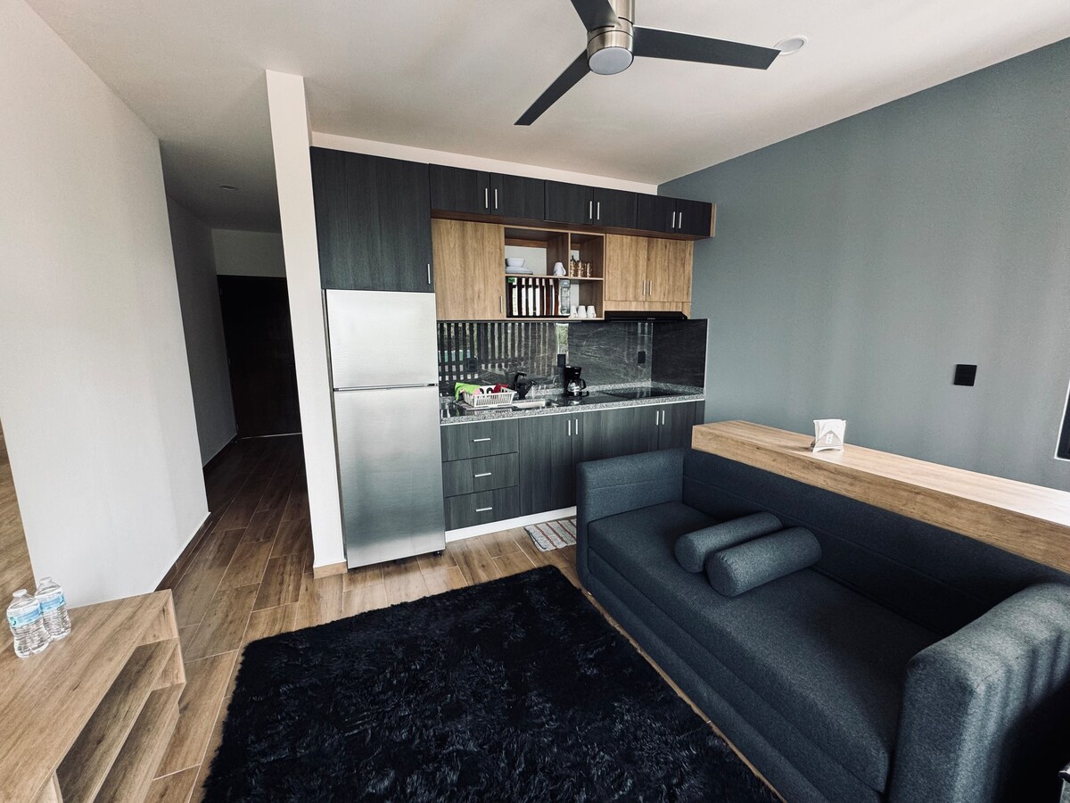 Moderno estudio en Oaxtepec Morelos, ideal para pasar unos días con tu pareja, familia o amigos. Te invitamos a disfrutar de un hospedaje tranquilo con todas las comodidades y atención que necesitas para relajarte. El espacio está diseñado y preparado con amor para tu llegada, cuenta con 1 recamara, baño privado, Smart Tv, terraza, asador, cocineta equipada, sala y comedor, además de disfrutar de albercas, gym, rooftop, jacuzzi y más. ¡No tendrás que salir para nada, bienvenido!
